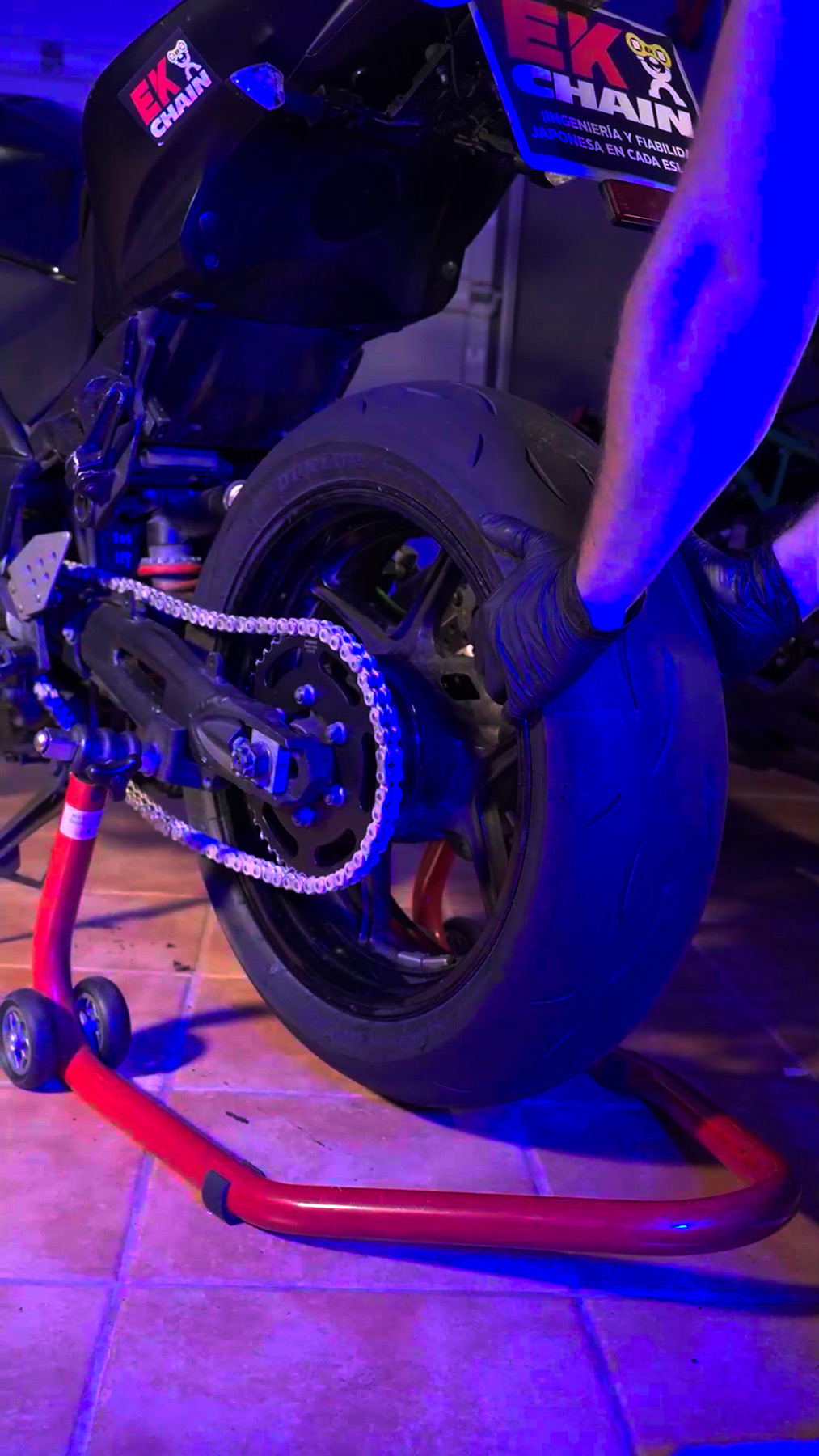 Es recomendable que una persona se suba a la moto para revisar el tensado con peso, especialmente si tu moto tiene un recorrido amplio de suspensión.
