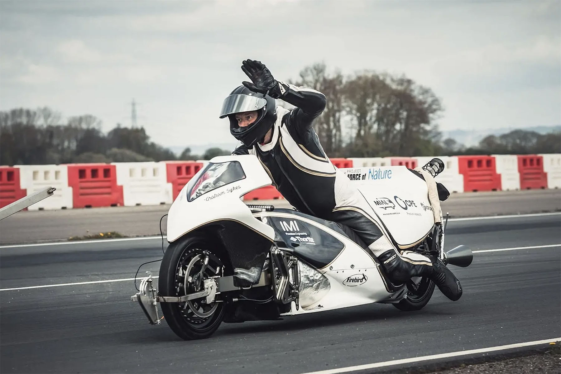 Graham Sykes rompe el récord de velocidad en moto sobre una moto de vapor que él mismo construyó en el cobertizo de su casa y que ha apodado "Force of Nature". Esta hazaña se ha registrado en la Semana de Velocidad de los Récords Mundiales de Reino Unido e ITA en Elvington, a finales de mayo de 2023.