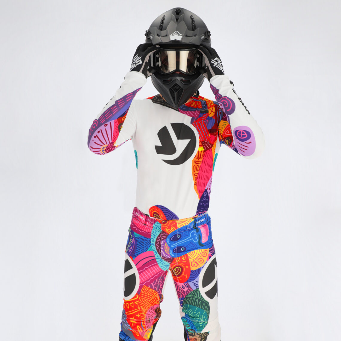El jersey y el pantalón de la gama X-TRACK está dedicados a quienes frecuentan los circuitos, pero también es muy versátil y apreciado por los aficionados o quienes se están iniciando en este mundo. Este conjunto enriquece la oferta con el nuevo color Nascar, disponible en Violeta/Rojo y Amarillo/Negro. Y también el diseño Stabi, presente en el catálogo en la variante Fucsia/Amarillo. La camiseta, de corte ceñido, es superligera y tiene amplias zonas en malla, desde las caderas hasta las axilas y el interior de las mangas. El pantalón es transpirable, elástico en la cintura con doble ajuste de velcro, cierre de botón y ajuste de plástico. Las rodillas están protegidas en el interior del pantalón por un refuerzo. Al igual que en la gama Flex, para el Track se utiliza el mismo tejido innovador AX SUEDE.
