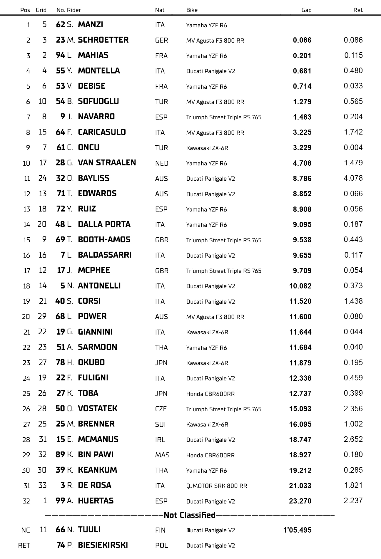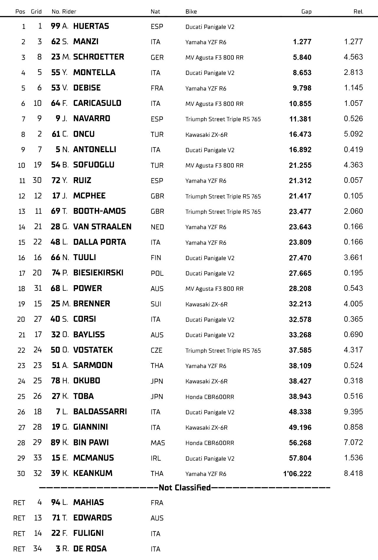 Sin embargo, Huertas lideraba con una pequeña ventaja en el ecuador de la primera manga, mientras que Öncü cedía distancia y veía peligrar su segundo puesto. Stefano Manzi y Lucas Mahias cazaron al turco y lo dejaron atrás. De hecho, el de Kawasaki fue de más a menos hasta ver cómo se le escapaban sus opciones de podio.