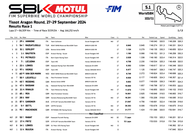 Parecía que Iannone podría ser presa de Razgatlioglu, Gerloff o Bautista en las últimas vueltas, pero fue entonces cuando sacó el as que tenía debajo de la manga: cambió el ritmo a tres del final con dos vueltas rápidas incluidas y pilló a contrapié a los demás. Razgatlioglu acusó el desgaste físico y tuvo que dar por buena la segunda plaza, y más teniendo en cuenta la baja de Bulega. Gerloff y Bautista lucharon hasta la última vuelta por la tercera plaza, dando oxígeno para que Toprak afianzase la segunda.