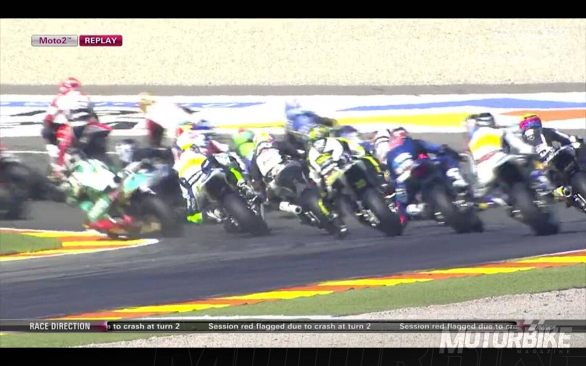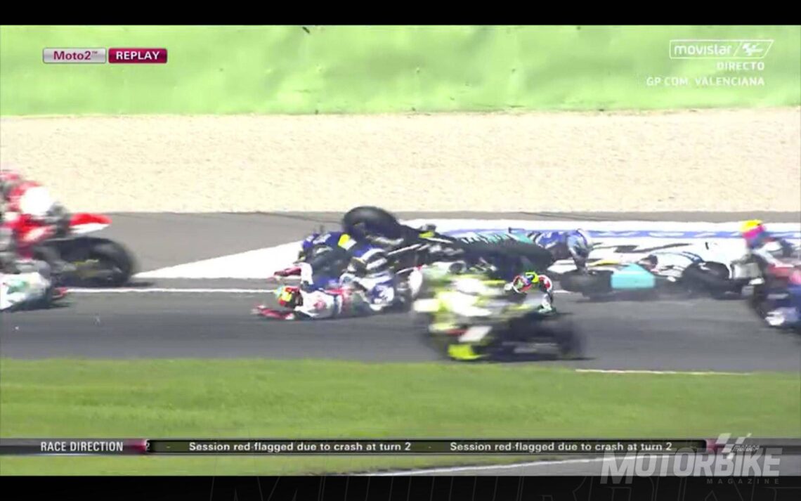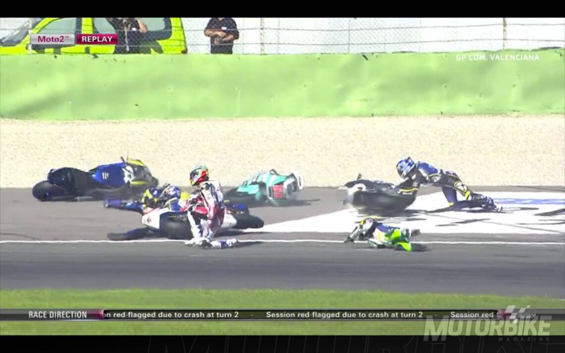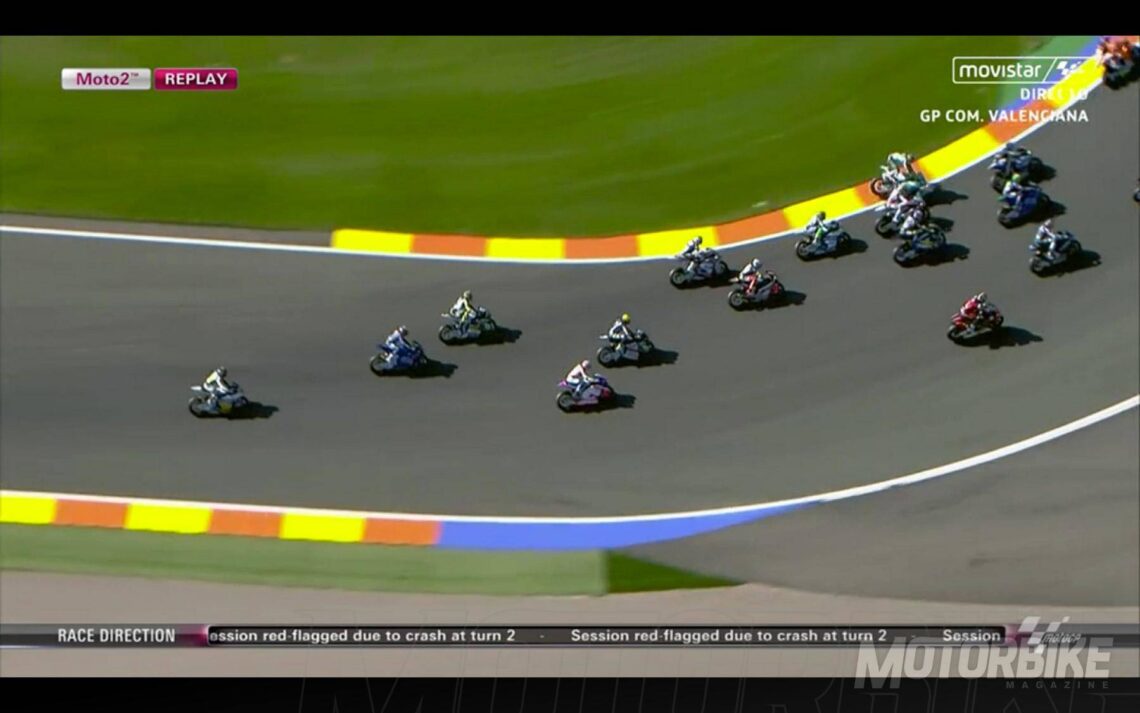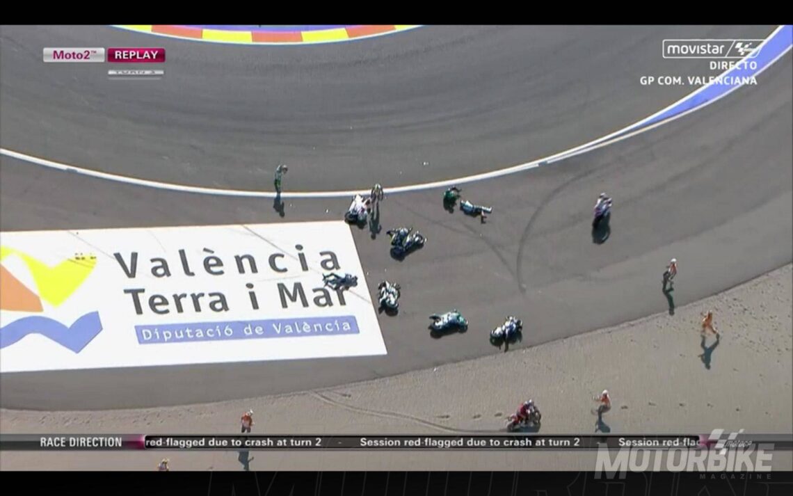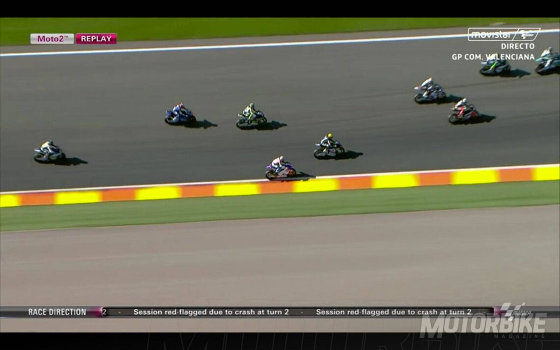 A penas se pudo superar una curva antes de sucederse una aparatosa caída tras la salida de Moto2 en el GP de Valencia. El malayo Hafizh Syahrin sufría un highside en el interior de la segunda curva del circuito que provocó una aparatosa caída con hasta nueve pilotos involucrados. El incidente provocó que dirección de carrera sacara bandera roja a los pilotos por lo que se interrumpe la carrera hasta las 12:45, cuando se retomará la salida de nuevo y se reducirá la longitud de la carrera a 18 vueltas para evitar retrasos en el resto de jornada.