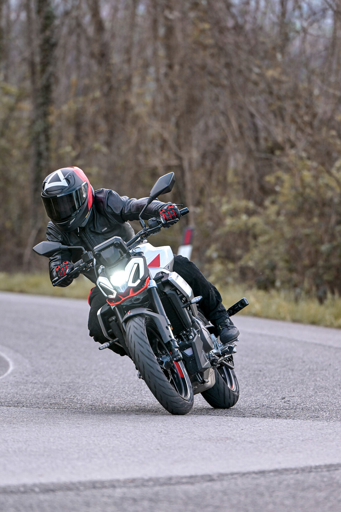 Dinámicamente está muy bien conseguida, diríamos aquello de que es muy juguetona. Flaquea un poco quizá en la suspensión, algo seca en el bache pequeño o asfalto irregular, pero si le exiges a la hora de apurar, aguanta muy bien el tipo. La sorpresa me la llevé más con los frenos, que, teniendo un solo disco delantero, funcionaban especialmente bien. Con un solo dedo gestioné el 99 % de las situaciones, llegando a hacer saltar el ABS si quería, sin mucho esfuerzo.