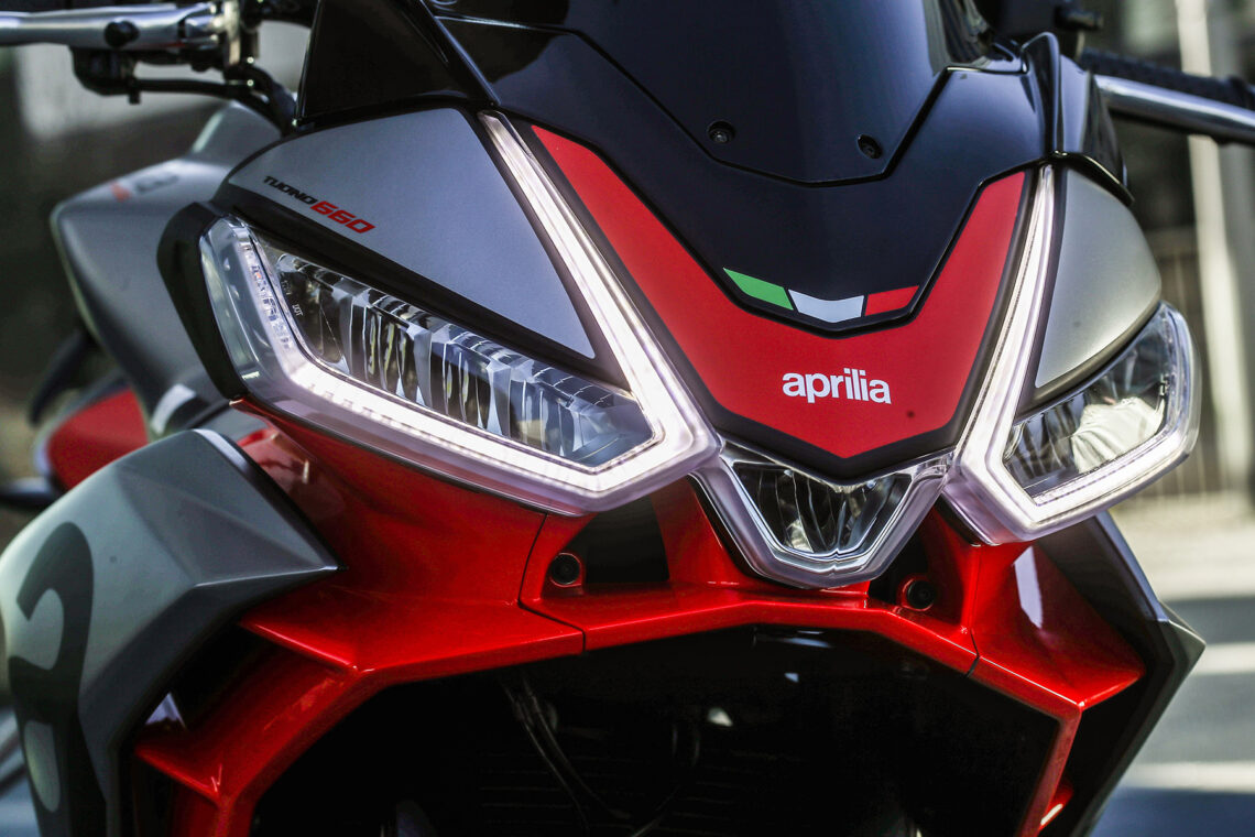 La Aprilia Tuono 660 es perfectamente reconocible como una máquina de la marca de Noale y, específicamente, de la familia naked italiana. Una de sus especificidades es que no es totalmente desnuda y cuenta con cierto cuerpo y carrocería, con un carenado superior fijado al chasis que sirva para proteger pero también para reducir el peso. La marca lo ha aprovechado y ha aplicado el concepto ya utilizado en la RS, como el doble carenado con función de apéndice aerodinámico, una solución que nace en el túnel de viento y aplicado en los mundiales de MotoGP y WSBK. El resultado aporta beneficios en cuanto a rendimiento y confort. El canal de aire formado en estos orificios hace la moto más estable a altas velocidades, pero a la vez hace más cómodo el recorrido al proteger del viento y recanalizar el aire caliente del motor.