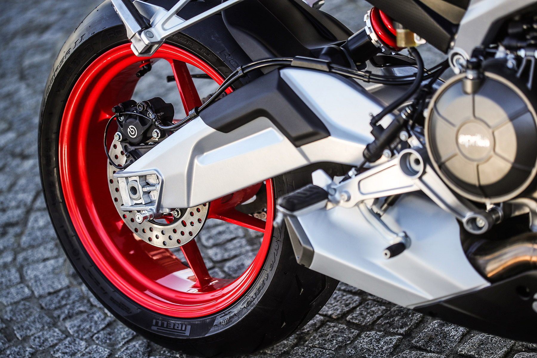 Una Aprilia que hereda ADN deportivo se caracteriza por contar con componentes de primera calidad. Se monta sobre un chasis sensacional de aluminio de doble viga con el motor como pieza autoportante que permite tener unas dimensiones muy compactas. Para las suspensiones, los ingenieros han elegido una horquilla invertida Kayaba de 41 mm y 110 mm mientras que el basculante trasero oscila sobre un monoamortiguador con 130 mm de recorrido y ajustables en precarga y extensión en ambos ejes. Para la frenada, también se ha puesto un gran esfuerzo, con un par de discos delanteros de 320 mm con un par de pinzas radiales Brembo. Los neumáticos elegidos también son de primer nivel, los Pirelli Diablo Rosso Corsa II.