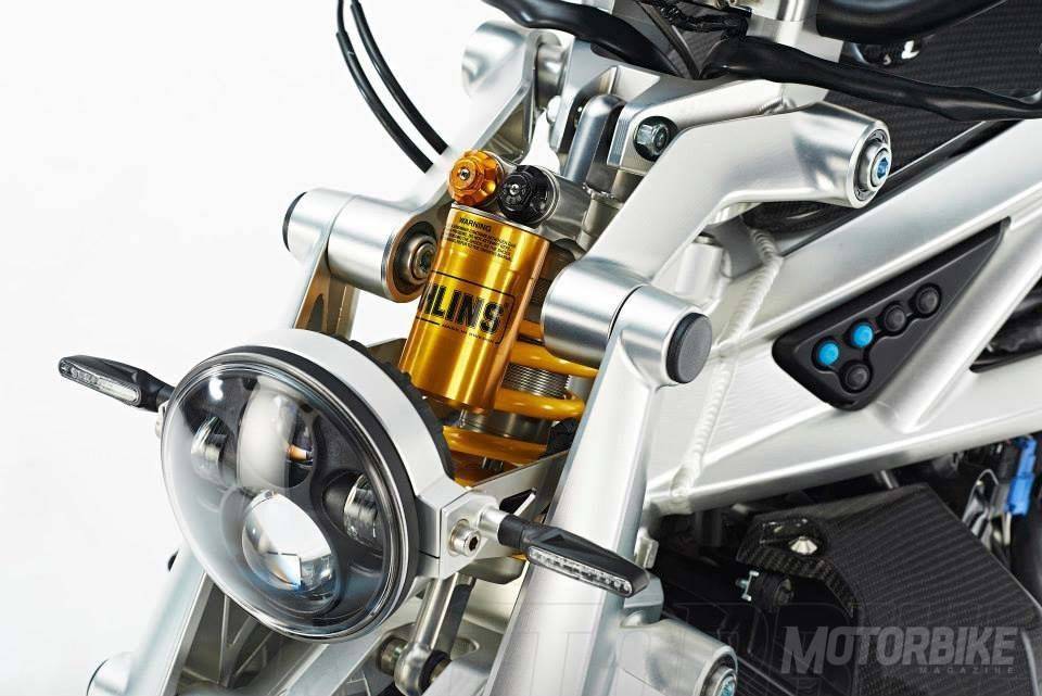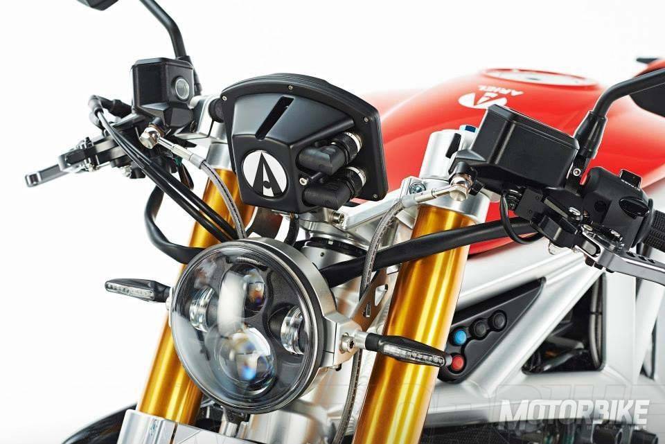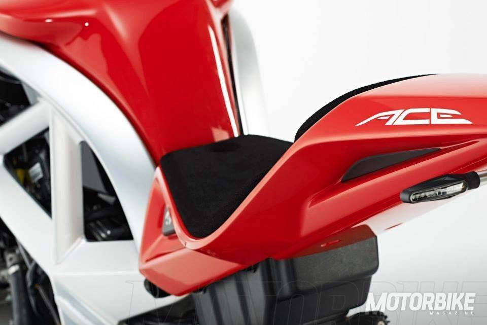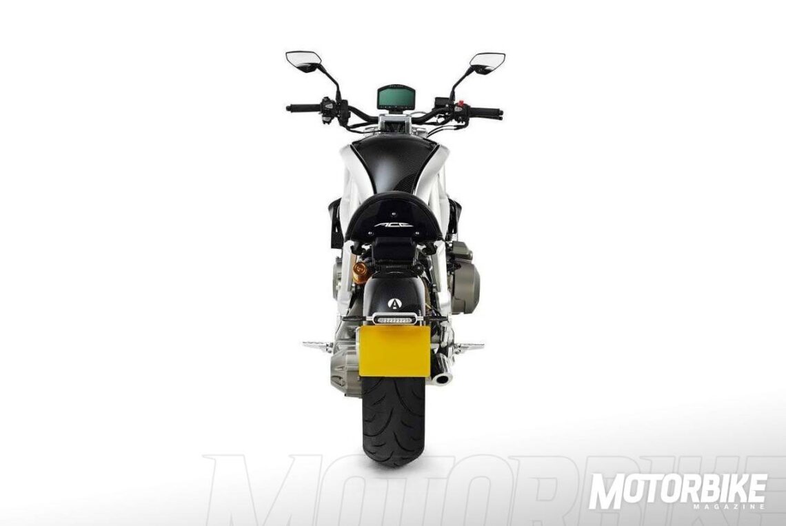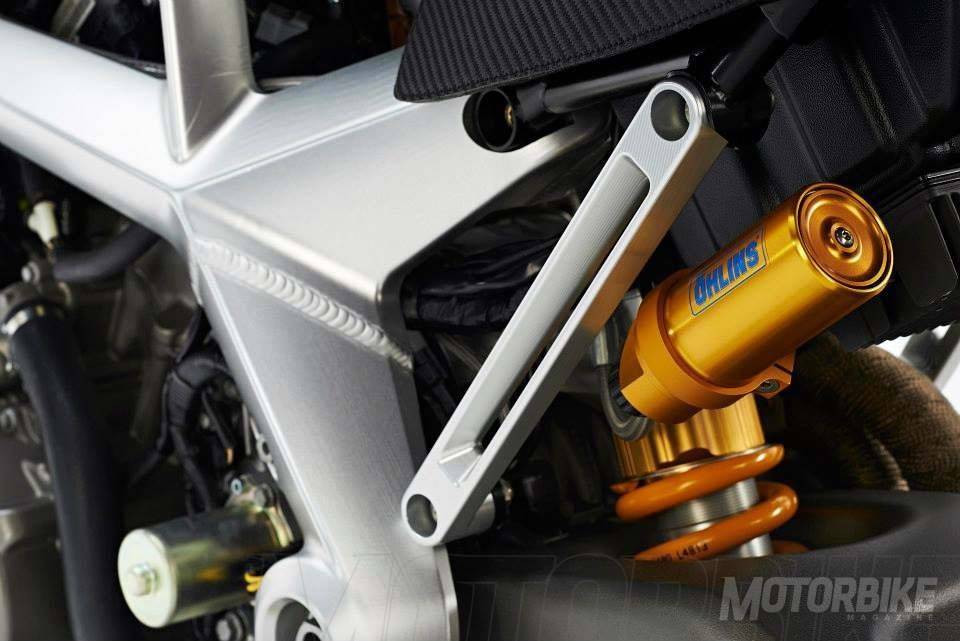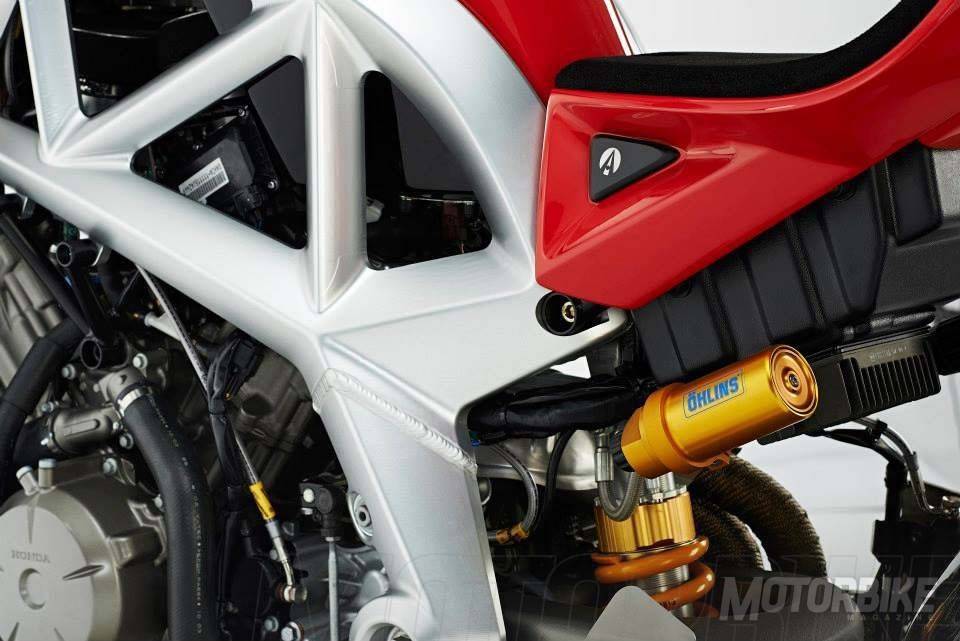 De momento, antes de tener más detalles de la Ariel Ace R, podemos ver fotos de la versión estándar, en la cual merece la pena pararse un rato a ver sus detalles. Destaca su chasis modular multitubular albergando el V4 de 1.237 cc de la VFR con unos 170 cv de potencia, al cual se le puede incluir la transmisión DCT de Honda, por cierto. Sorprende la amortiguación delantera de viga con Öhlins TTX (horquilla Öhlins la de base) o los frenos Nissin con pinza de seis pistones aunque también puedes instalarle Brembo como opción.