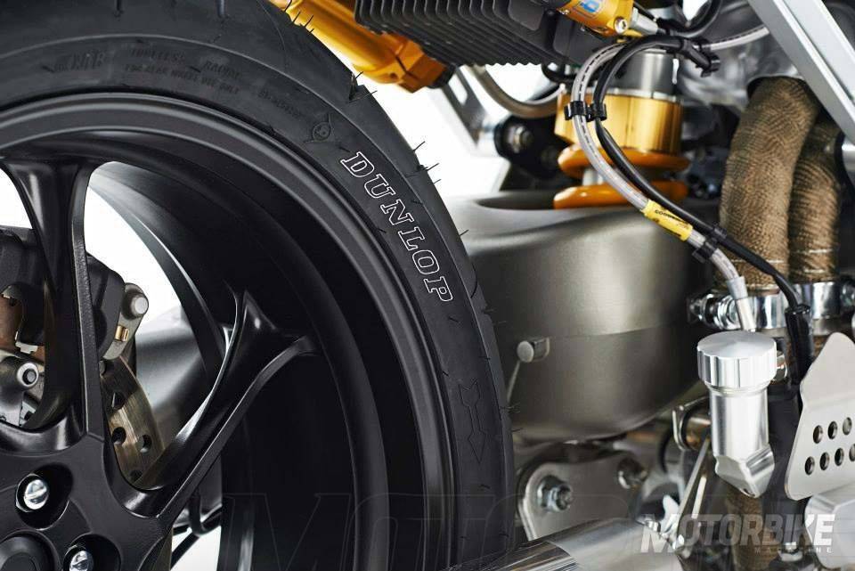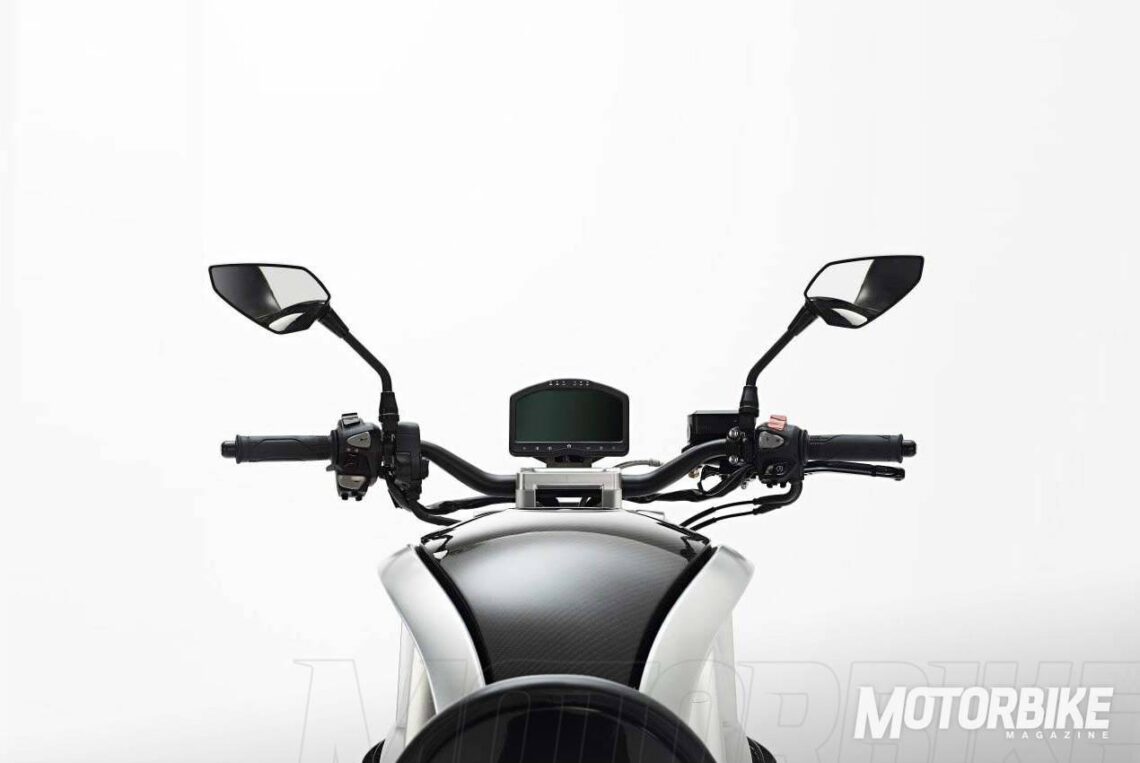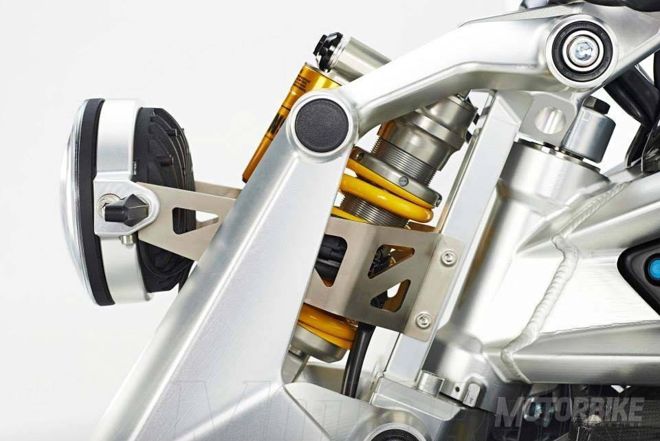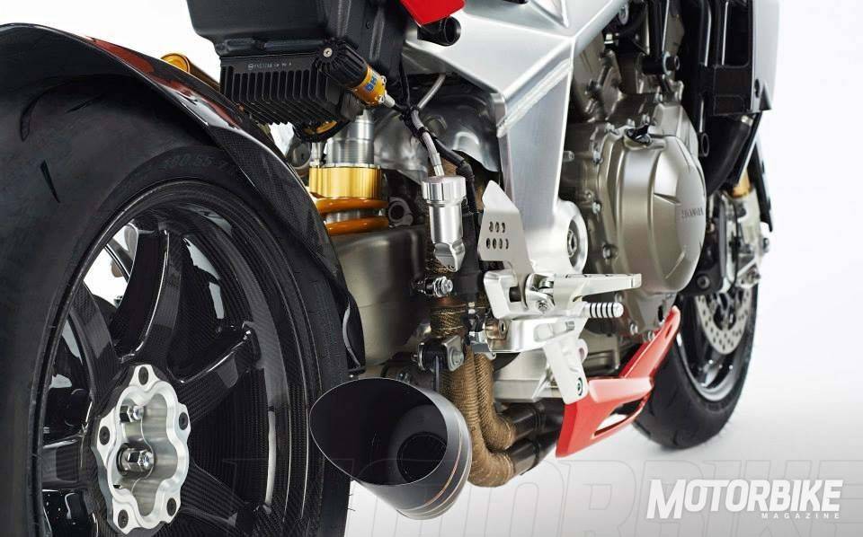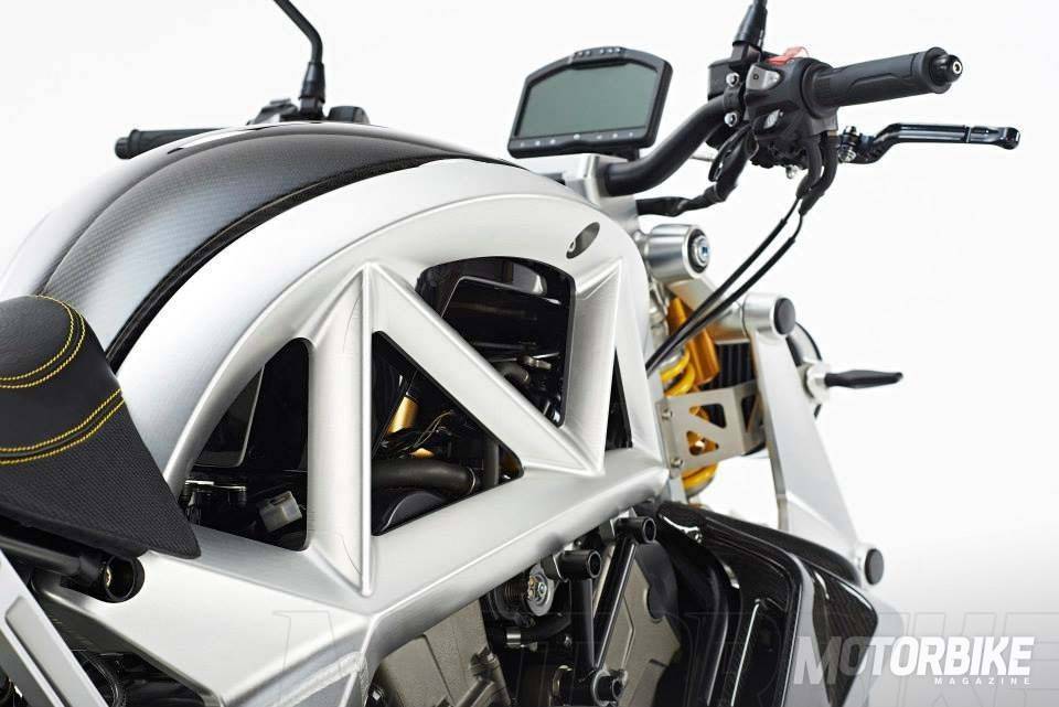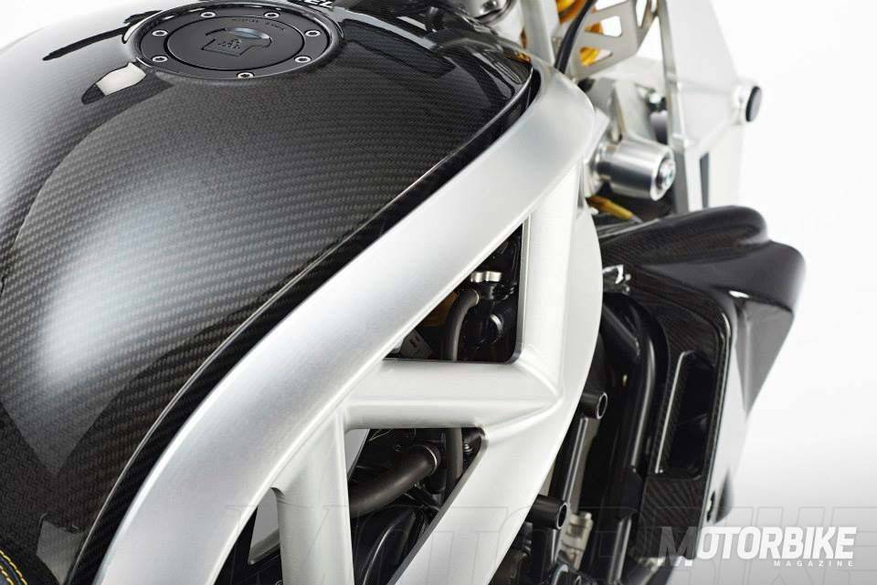 De momento, antes de tener más detalles de la Ariel Ace R, podemos ver fotos de la versión estándar, en la cual merece la pena pararse un rato a ver sus detalles. Destaca su chasis modular multitubular albergando el V4 de 1.237 cc de la VFR con unos 170 cv de potencia, al cual se le puede incluir la transmisión DCT de Honda, por cierto. Sorprende la amortiguación delantera de viga con Öhlins TTX (horquilla Öhlins la de base) o los frenos Nissin con pinza de seis pistones aunque también puedes instalarle Brembo como opción.