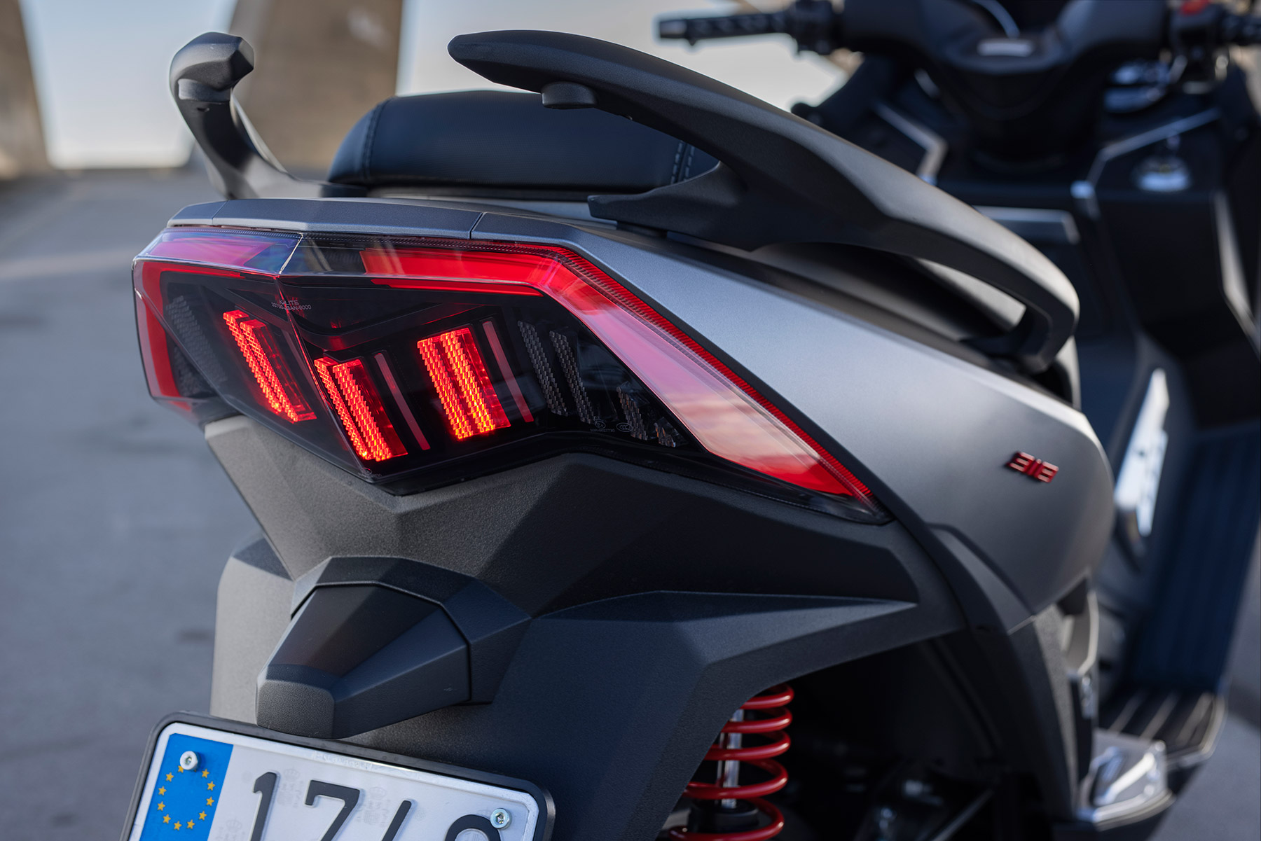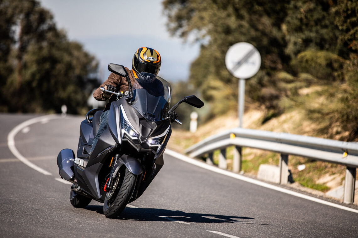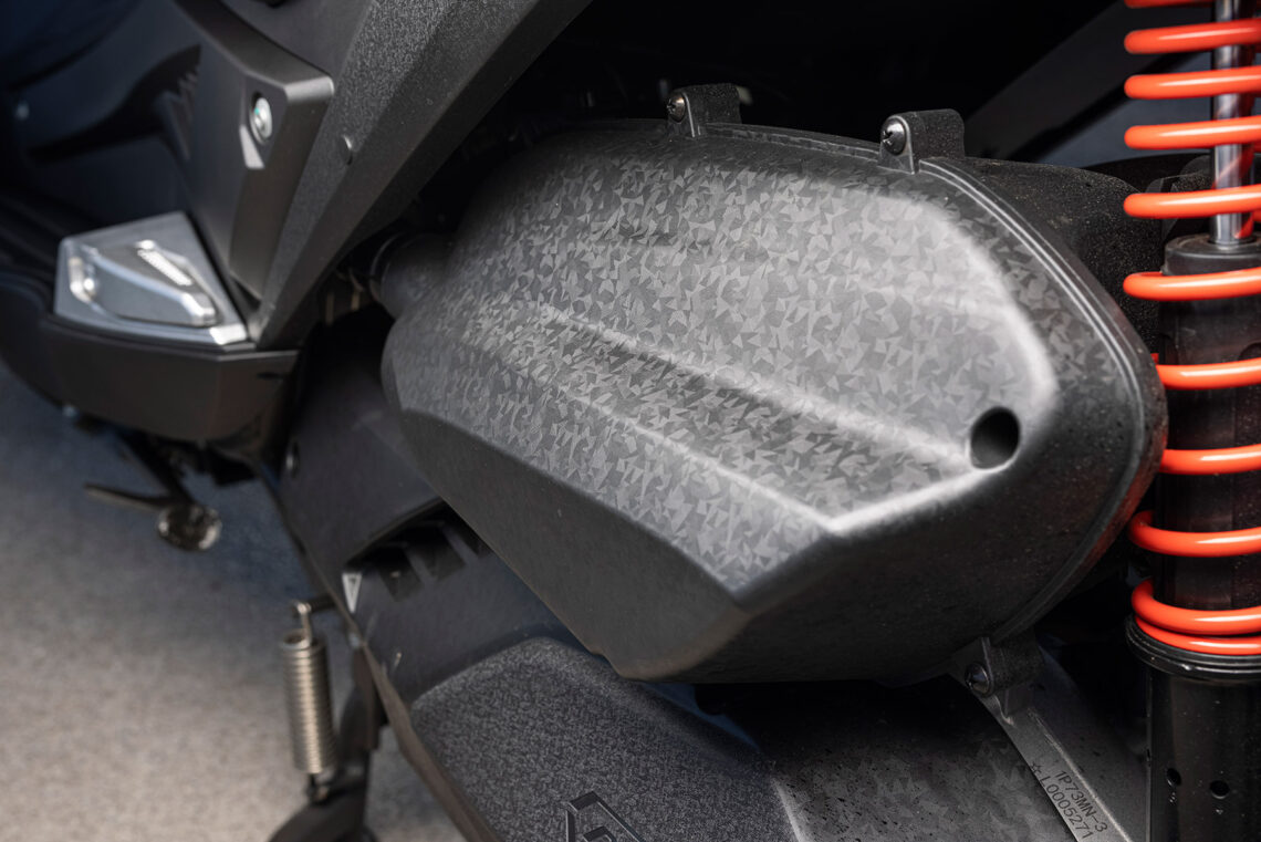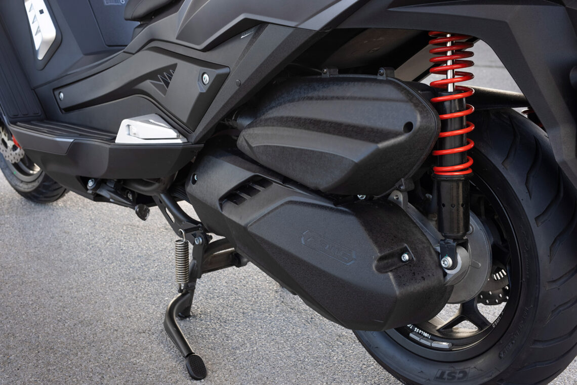 Como vemos, los componentes son de primer orden y no ha habido reparos a la hora de tirar del mercado global. El ABS lo suministra la alemana Bosch y cuenta con un doble disco delantero de perfil lobulado mordido por pinzas de cuatro pistones de anclaje radial, detrás el habitual disco con pinza de simple pistón. Los neumáticos los suministra Pirelli, lo cual redunda en su seguridad y calidad de rodadura, y tienen unas medidas de 120/80-14” para el delantero y 150/70-13” el neumático trasero. El bastidor es una estructura tubular de acero provisto de una horquilla telescópica convencional en el tren delantero y detrás emplea una pareja de amortiguadores. El embrague centrífugo lo suministra la japonesa FCC, misma nacionalidad que los rodamientos NTN que monta o las piezas que forman la carrocería. Por cierto, a prueba de malos tratos como insiste en demostrar el dueño de la marca al dar a conocer el producto…