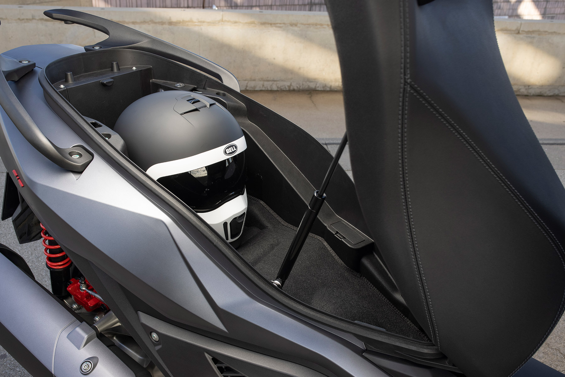 A la hora de estacionarlo cuenta con detalles como el símbolo inscrito en la parte posterior de la plataforma para el pie izquierdo en forma de huella animal, que indica dónde se puede actuar sobre la pata lateral. Algo a lo que le vemos sentido sólo cuando no es el vehículo habitual. Por cierto, al igual que muchos otros scooter con la pata lateral extendida a la hora de intentar arrancarlo el motor gira en vacío pero nunca se pondrá en marcha. Es algo que no nos gusta y preferiríamos que simplemente no girase el motor de arranque. O mejor aún, que arrancase pero que al intentar iniciar la marcha no fuera posible, como permitían los scooter Peugeot. Algo práctico cuando queremos dejar calentar el motor antes de salir.