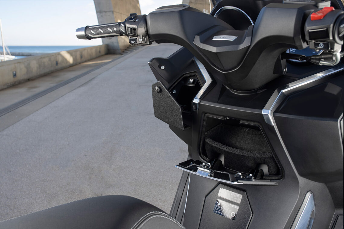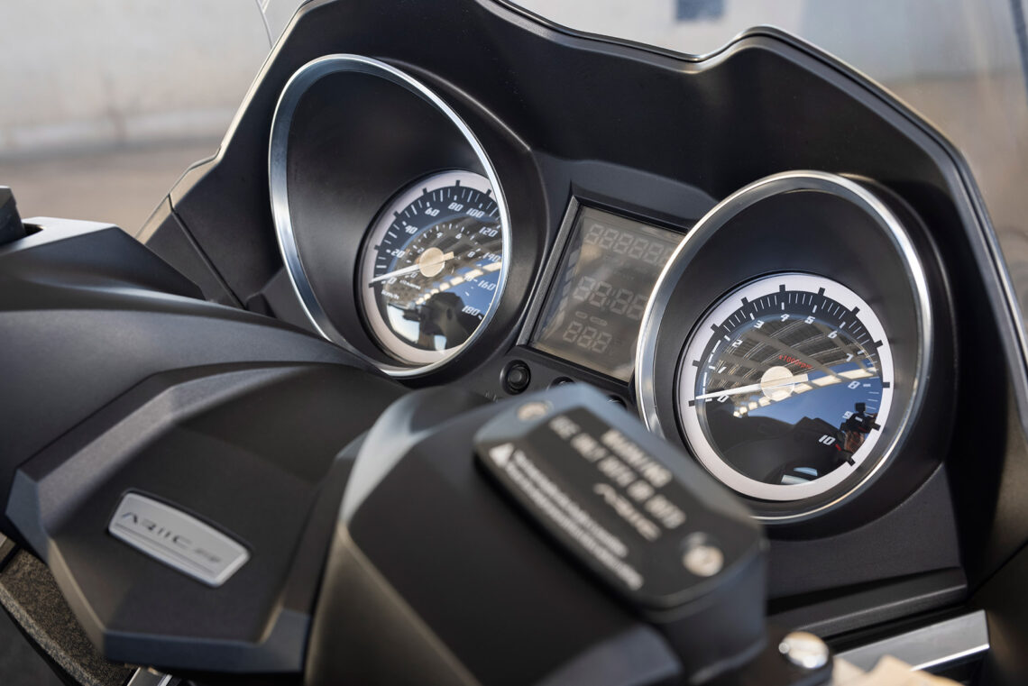 El sistema de alumbrado y señalización es al completo de LED y cuenta con un par de tomas USB para la recarga de los habituales aparatos electrónicos, ubicadas en una de las dos guanteras delanteras y la otra en el hueco bajo el asiento, que además está iluminado para facilitar encontrar lo almacenado cuando escasea la luminosidad. Este espacio es capaz de albergar un casco integral y bastante más. El cuadro de relojes es de diseño clásico y está formado por un par de relojes que se encargan de informar de la velocidad y el régimen de giro del motor. Entre medias encontramos la habitual información digital referente al recorrido total y parcial, además de la temperatura ambiente y el voltaje de la batería, con el buen detalle de contar con dígitos más grandes de lo habitual.