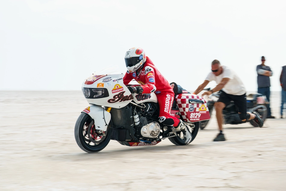 No es la primera vez que Indian escribe su nombre en la historia de Bonneville, pero esta vez lo ha hecho con un modelo muy particular: una Challenger de la serie King of the Baggers, equipada con carenado y maletas, que demostró que incluso una bagger como ella puede volar en la recta infinita de Utah.