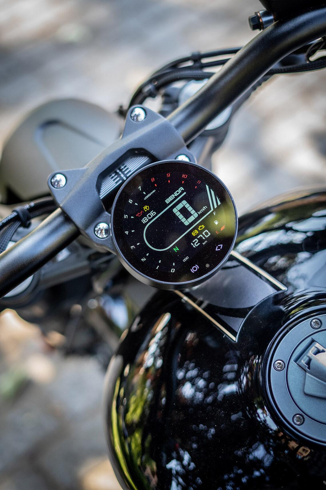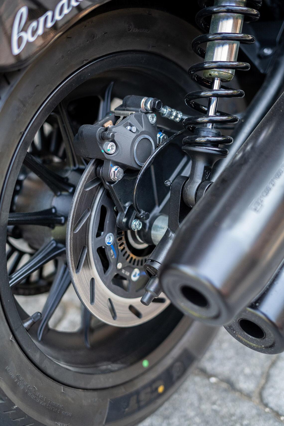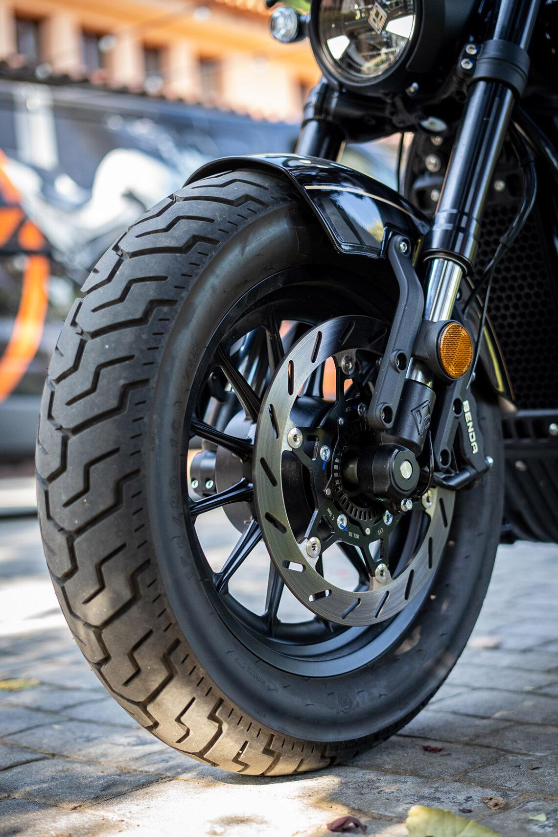 La frenada recae en dos discos, uno delantero de 320 mm con pinza de anclaje radial de 4 pistones y otro trasero de 260 mm que cumplen bien su cometido, sobre todo si accionas ambos, con neumáticos firmados por CST (Cheng Shin Tire). Aunque estos tienen un perfil alto (la estética bobber así lo exige), con 80 y 65 mm respectivamente, la llanta "pequeña" ofrece más agilidad que las de 19 y 18 pulgadas que también se estilan en este sector.