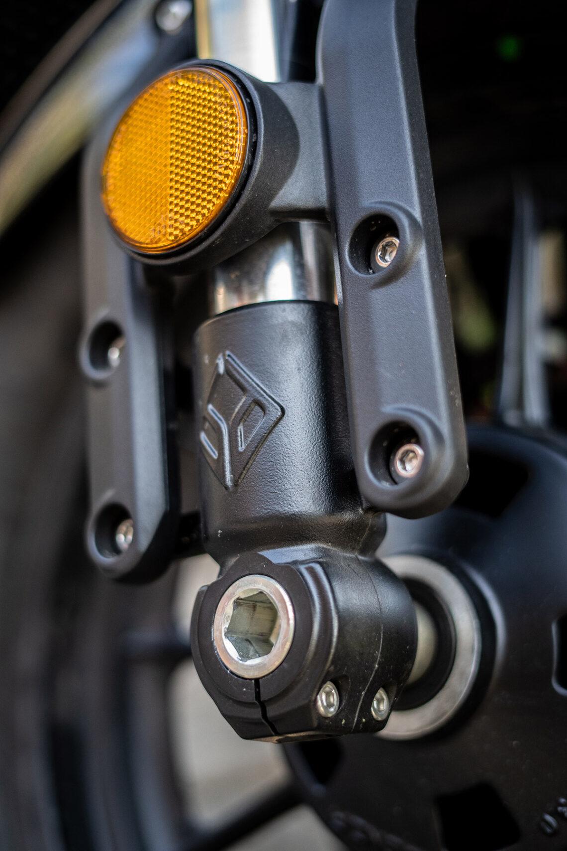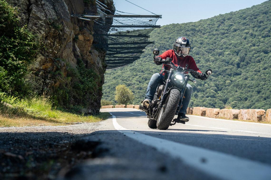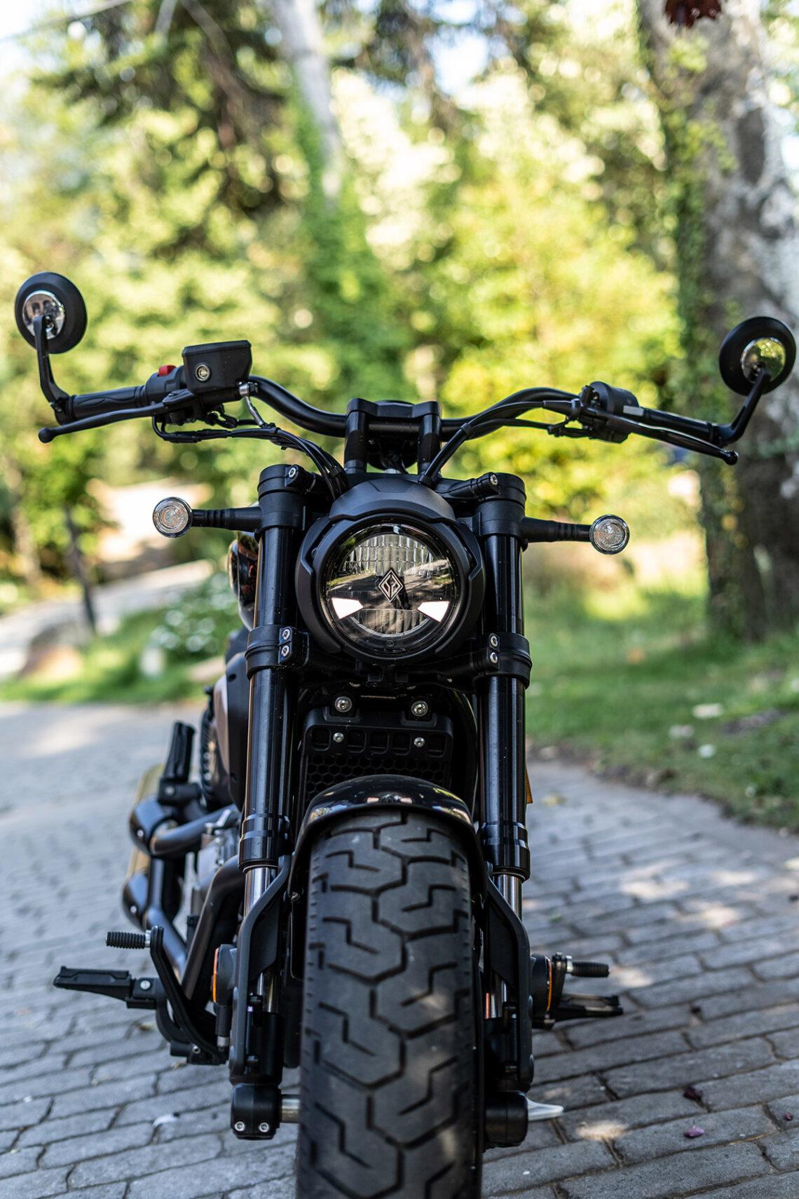 La frenada recae en dos discos, uno delantero de 320 mm con pinza de anclaje radial de 4 pistones y otro trasero de 260 mm que cumplen bien su cometido, sobre todo si accionas ambos, con neumáticos firmados por CST (Cheng Shin Tire). Aunque estos tienen un perfil alto (la estética bobber así lo exige), con 80 y 65 mm respectivamente, la llanta "pequeña" ofrece más agilidad que las de 19 y 18 pulgadas que también se estilan en este sector.