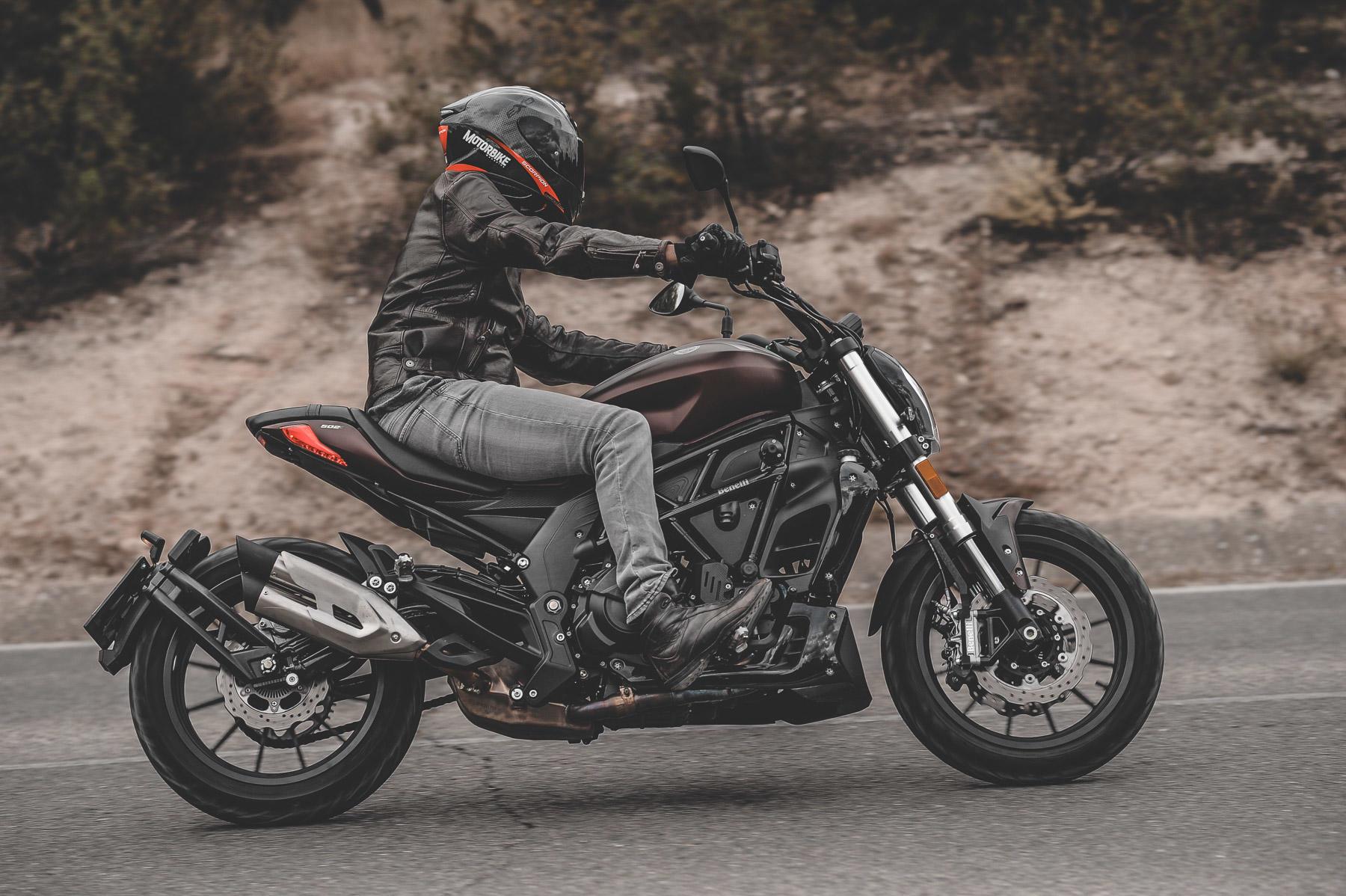 Con las geometrías que puedes apreciar a simple vista, tal vez te entren dudas de sus capacidades dinámicas. Sin embargo, una vez te subes en ella, verás que rápidamente se disipan. El asiento es bastante bajito (750 mm) por lo que llegarás sin problema al suelo. Las estriberas adelantadas no lo son en exceso y, aunque puede recordarte la postura a la Ducati Diavel o la gran Triumph Rocket 3 GT. las piernas no irán tan estiradas. Esta colocación a los mandos hace que el pilotaje sea particular aunque en unos pocos km estarás adaptado perfectamente a ella y a jugar con sus 6 velocidades. La posición es cómoda, gracias a su súper confortable asiento, y te da un aire de “rey del asfalto” que a mí particularmente me gusta mucho. Manillar ancho y pies delante… ¿algún problema conmigo?