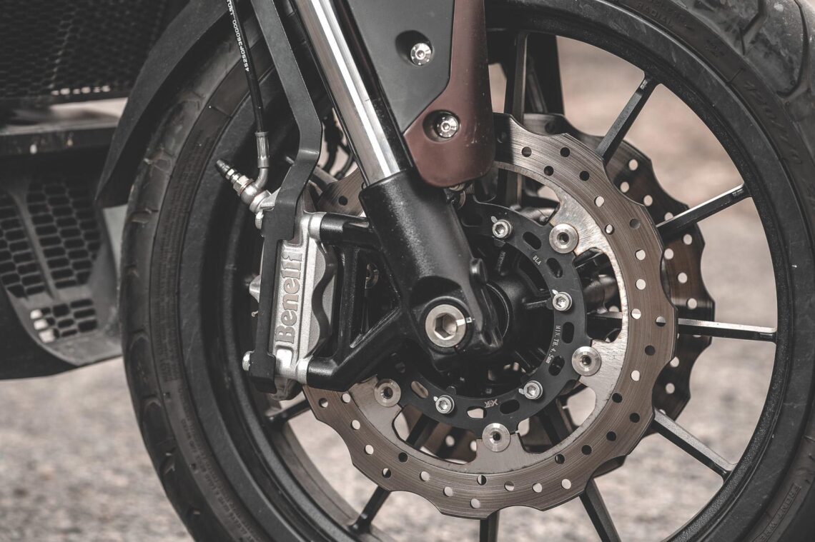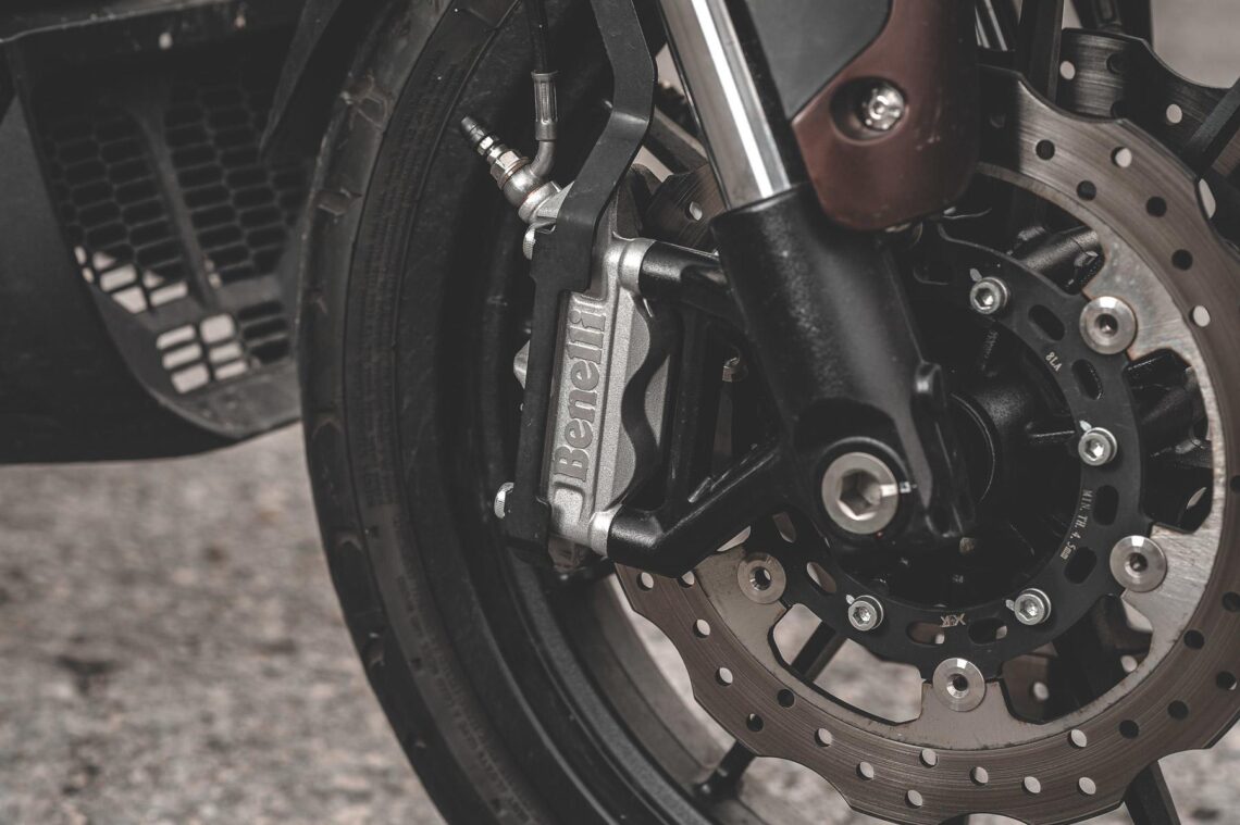 La frenada es suficiente para sus prestaciones. El doble disco delantero y sus pinzas radiales tienen potencia más que de sobra para detener a esta Benelli 502C. Puedes someterla a una buena mañana de curvas que no se verán fatigados. Además, lo harán con un tacto progresivo e intuitivo, detalle que se agradece para el uso diario.