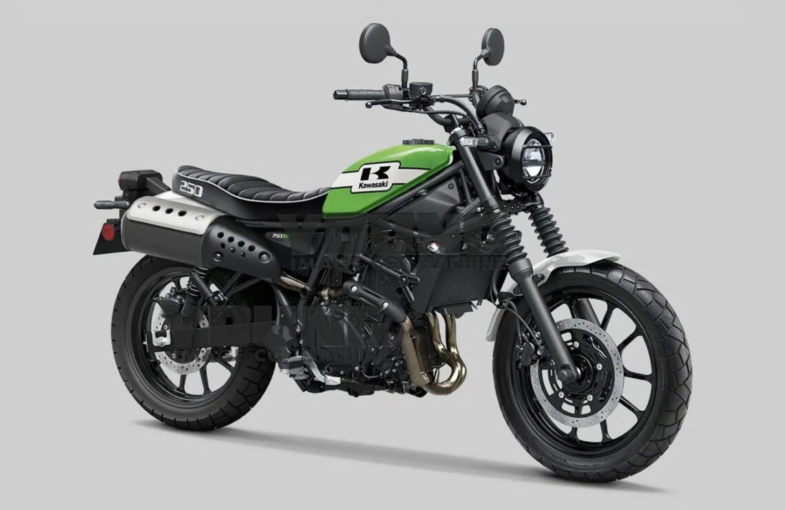 Neumáticos mixtos, chasis de espina central plano, depósito de lágrima con decoración Kawasaki vintage, fuelles en las horquillas, asientos tapizados de cuero con imagen vintage. La lista de ingredientes parece perfecta para una rápida y efectiva ensalada de motos scrambler de baja cilindrada y buena aceptación de mercado.
