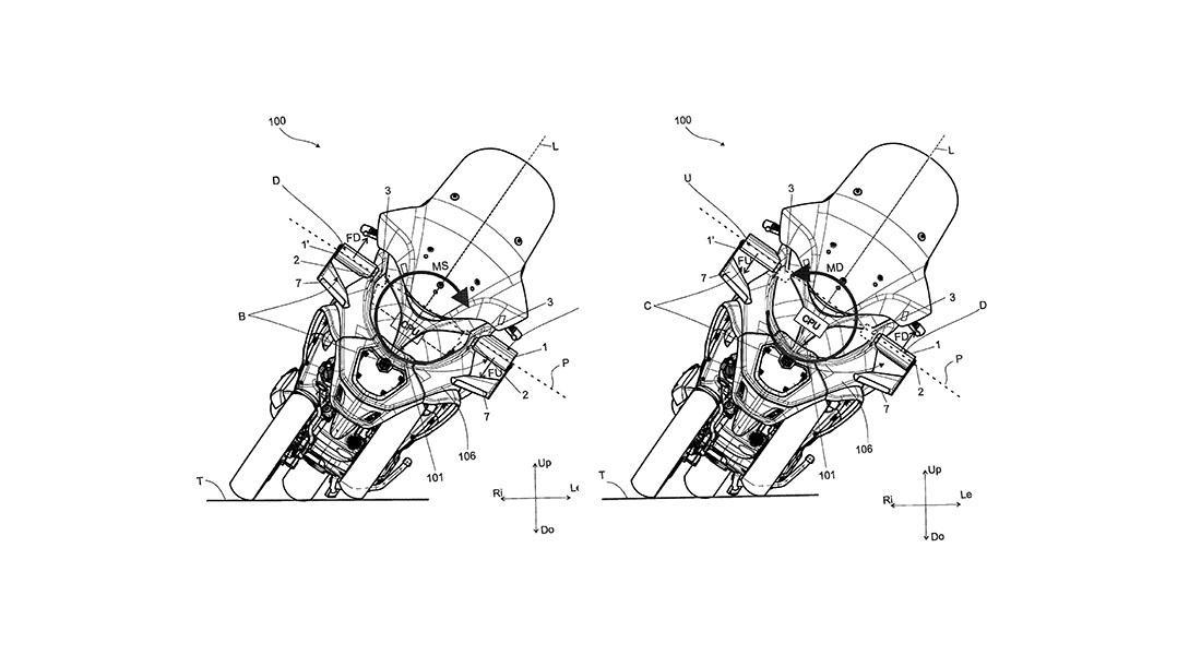 Así es, se trata de unos apéndices aerodinámicos móviles, o activos, gestionados por una centralita. Esto es lo que podemos ver en los bocetos de los diseños pendientes patente. El Piaggio MP3 es un scooter de tres ruedas, que gira mediante inclinación pro sobre dos puntos de apoyo en el tren delantero, lo que exige un poco más de esfuerzo o fuerza al piloto de cara a inclinar. Pero ahora, parece estar trabajando en un sistema móvil e "inteligente" que se activa según el grado de inclinación que se precisa (y que se registra por una centralita con sensor de inclinación) para facilitar la inclinación del scooter.