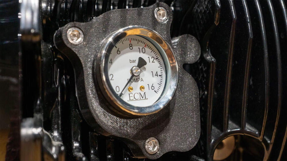 La base estética y conceptual de esta máquina está en el imponente bóxer de 1.802 cc de BMW, aunque lo que se esconde en su interior es una cafetera profesional ECM de tipo siebträger. Este sistema permite trabajar con dos circuitos de agua independientes, lo que facilita preparar café y espuma de leche al mismo tiempo.