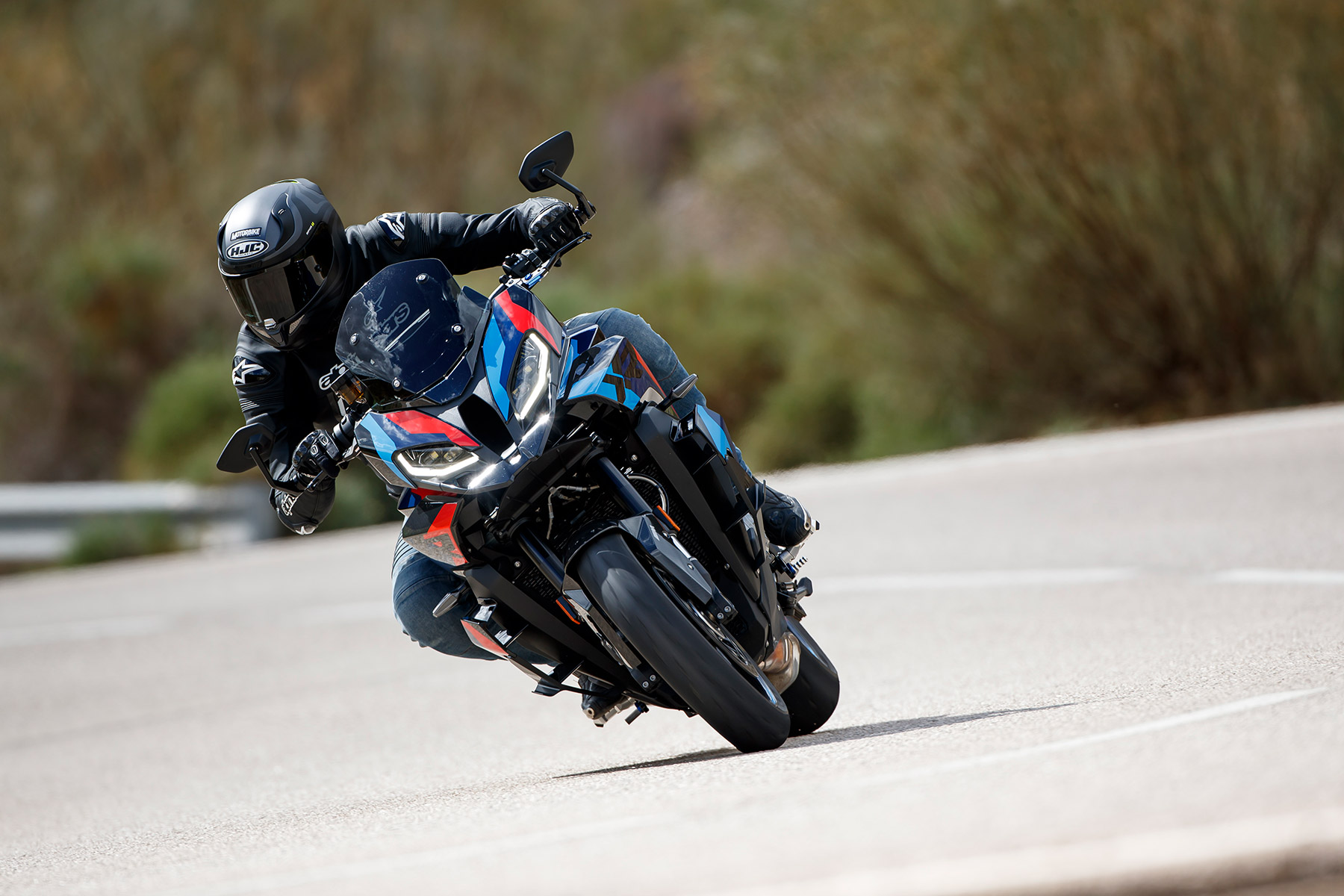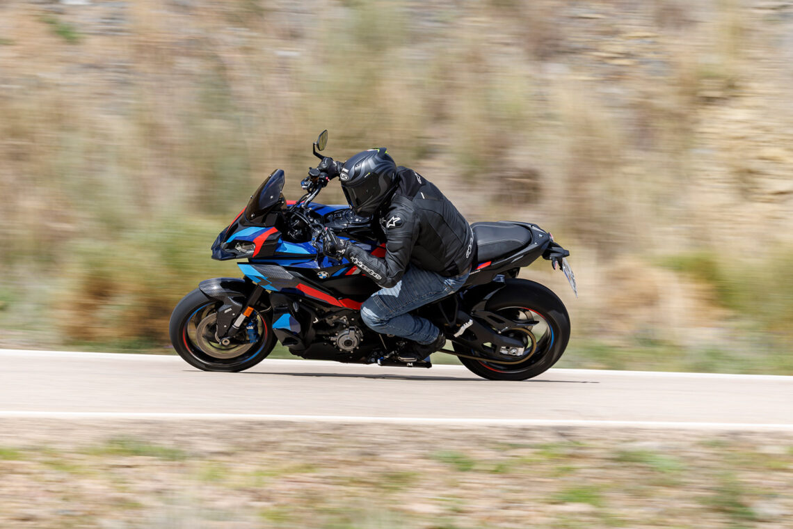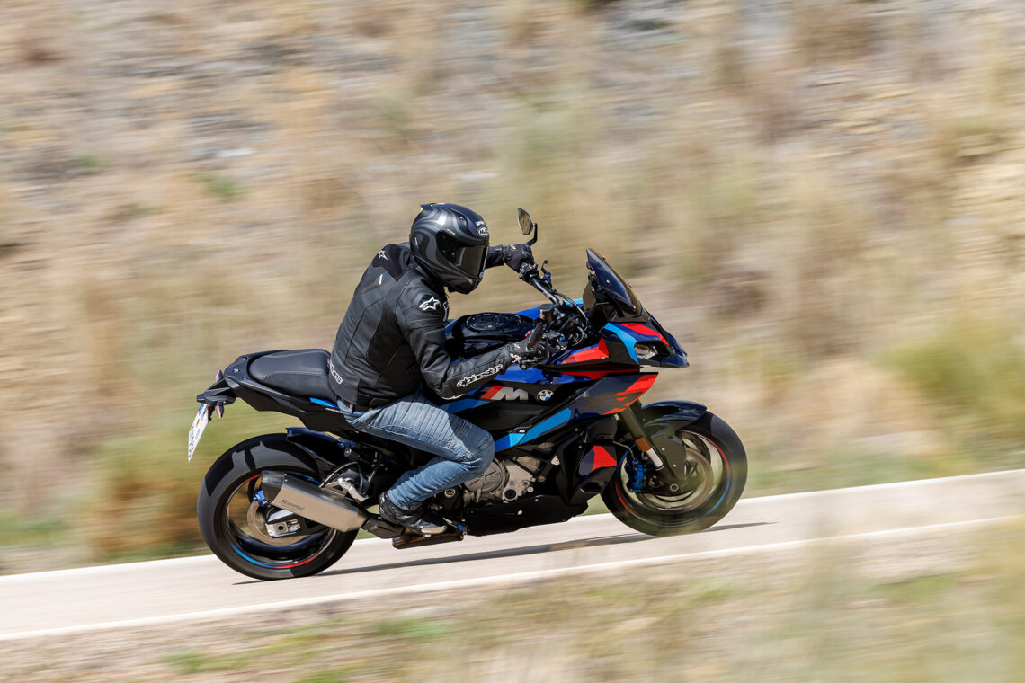 A primera vista, la M 1000 XR MC intimida por presencia y empaque, una moto que también llama la atención por su dotación aerodinámica. Alerones laterales y colín específicos pegan el tren delantero al suelo a partir de 100 km/h, llegando a 11 kg de carga a 220 km/h. La postura es cómoda a sus mandos, muy trail, pero el asiento está alto (a 85 cm del suelo) y el manillar de aluminio con inscripciones láser, anclado a la tija mediante una exquisita abrazadera fresada, está adelantado respecto al de la S 1000 XR. El objetivo de todo esto es cargar más peso (53.3% en vez de 52.3%) para evitar que la rueda delantera "despegue" al infinito. En cualquier caso, notas como si las ruedas fuesen pegadas al asfalto guiadas por un raíl en todo momento: impresionante.
