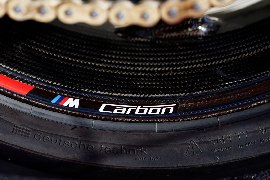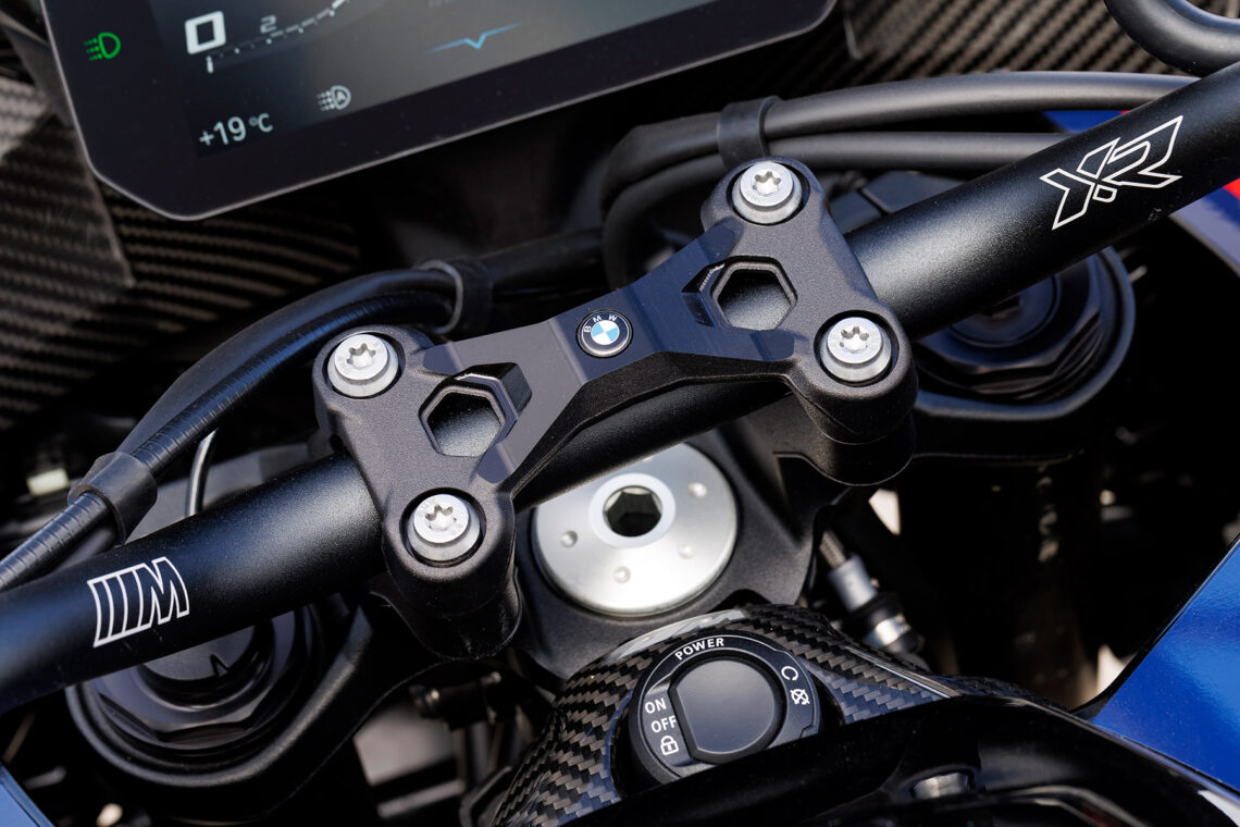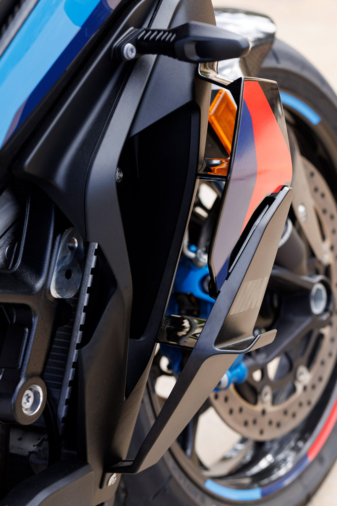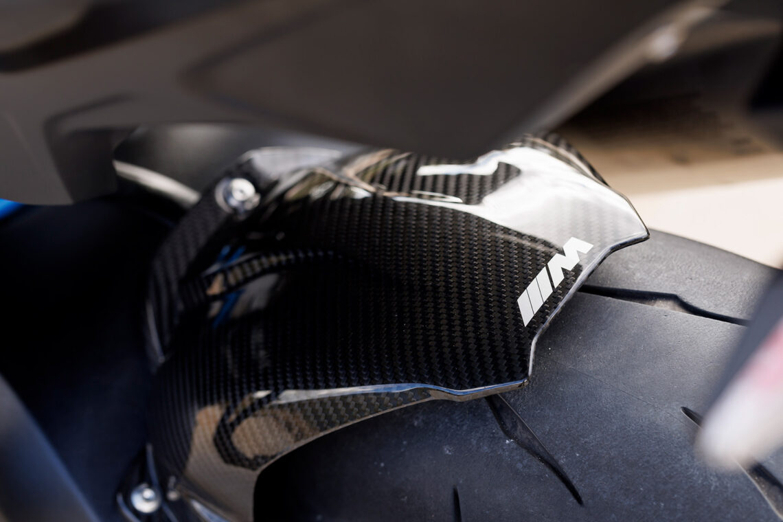Nuestra unidad de pruebas incluye Pack M Competition con el que, además de ascender a 35.147 €, bajas 3 kg el peso total (7 kg menos que la S 1000 XR) y minimizas las inercias gracias al uso masivo de piezas de fibra de carbono (llantas, paneles laterales, guardabarros, cubrecadena, embellecedor de cerradura y paneles frontales), estriberas de aluminio fresado (conductor y pasajero) regulables y telemetría Lap-trigger GPS 2D. Los retrovisores en las puntas del manillar (opcional) también dan el toque.