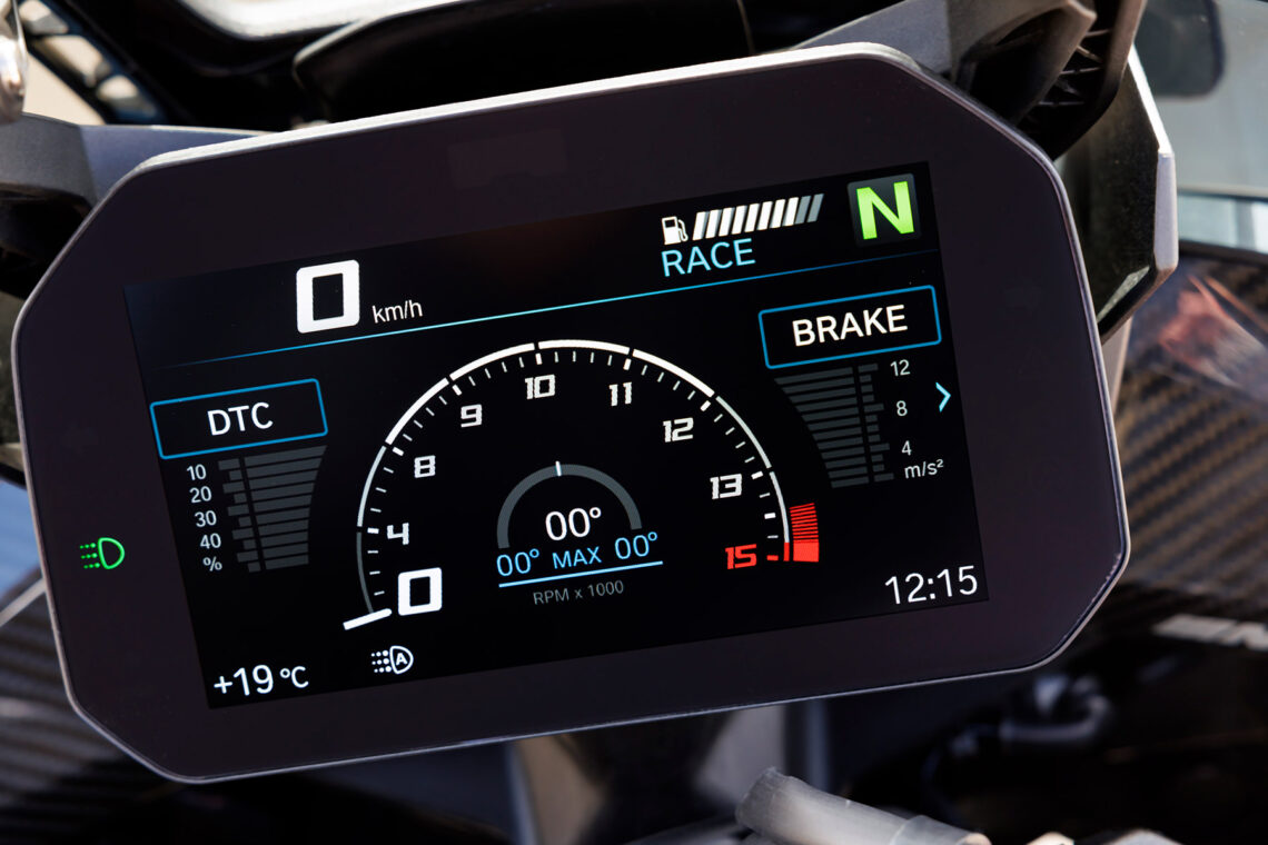 La M 1000 XR puede conducirse jugando con los cuatro modos estándar (Rain, Road, Dynamic, Race) o adentrarte en el universo BMW M con el trío Race Pro. El escalonamiento en la entrega de potencia y nivel de intervención está claro para los primeros, permitiendo su personalización en los Pro. Para empezar, el control de freno motor es regulable en 3 niveles, mientras que el de tracción tiene otras 14 sensibilidades diferentes. Por otro lado, el control de derrapada en frenada funciona cuando el embrague no está accionado, a menos de 3.000 rpm y con una deceleración de 5.5 m/s2 como mínimo. Este sistema permite frenar derrapando durante la entrada en curva, manteniendo un deslizamiento constante en toda la trazada.