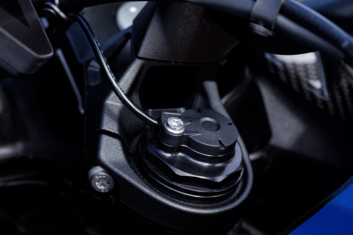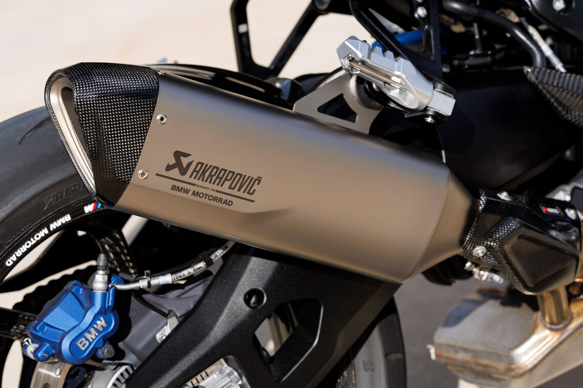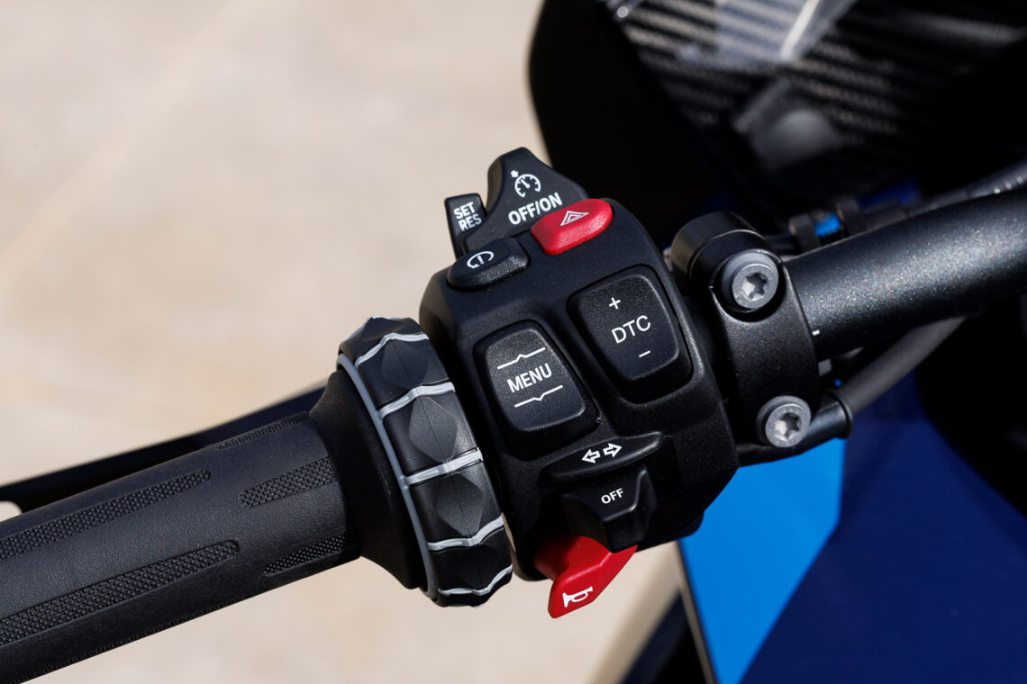 Otros puntos destacables son la instrumentación TFT a color de 6.5" (con conectividad y cuentavueltas rediseñado), las pinzas de freno Nissin M (azul anodizado) con latiguillos metálicos y bomba radial Nissin, iluminación full-LED con luces cuneteras, toma de corriente USB, manetas regulables abatibles fresadas, puños calefactables, llave de proximidad, portamatrícula corto, silenciador de titanio Akrapovic (colector con doble catalizador), guantera smartphone y depósito de gasolina de 20 l. (4 l. de reserva).