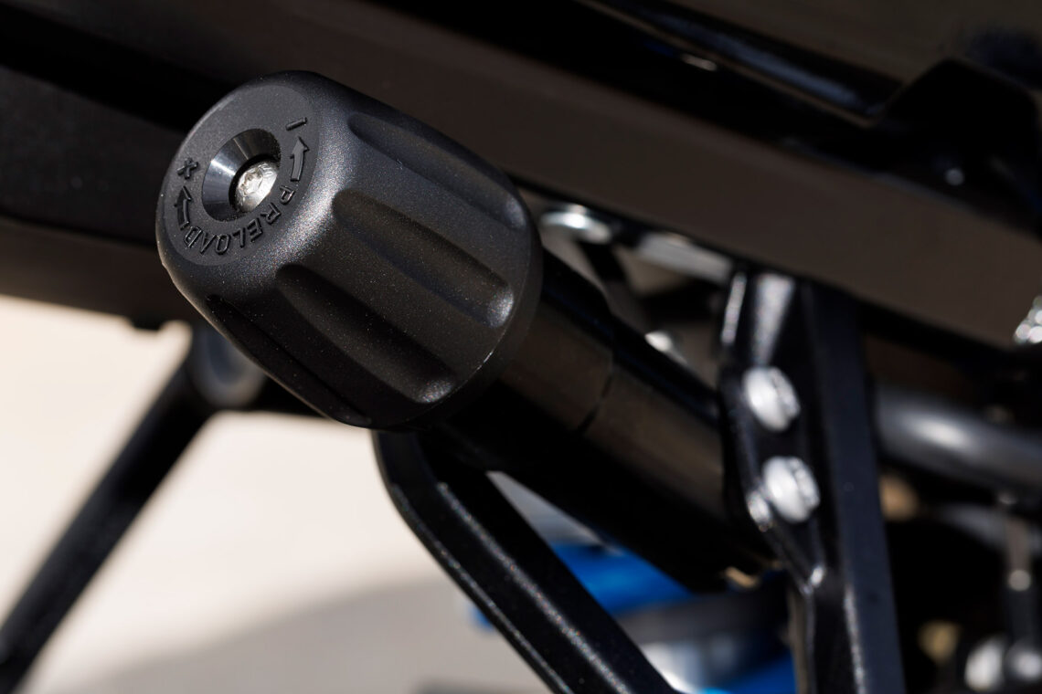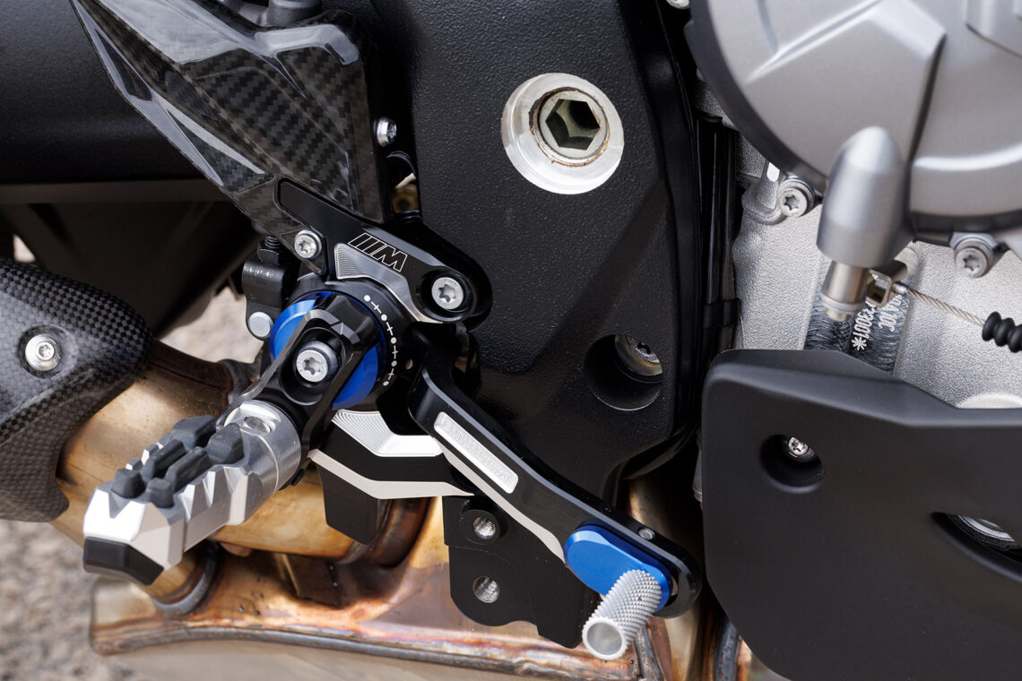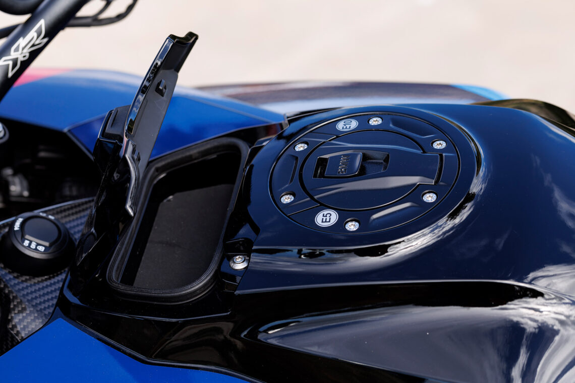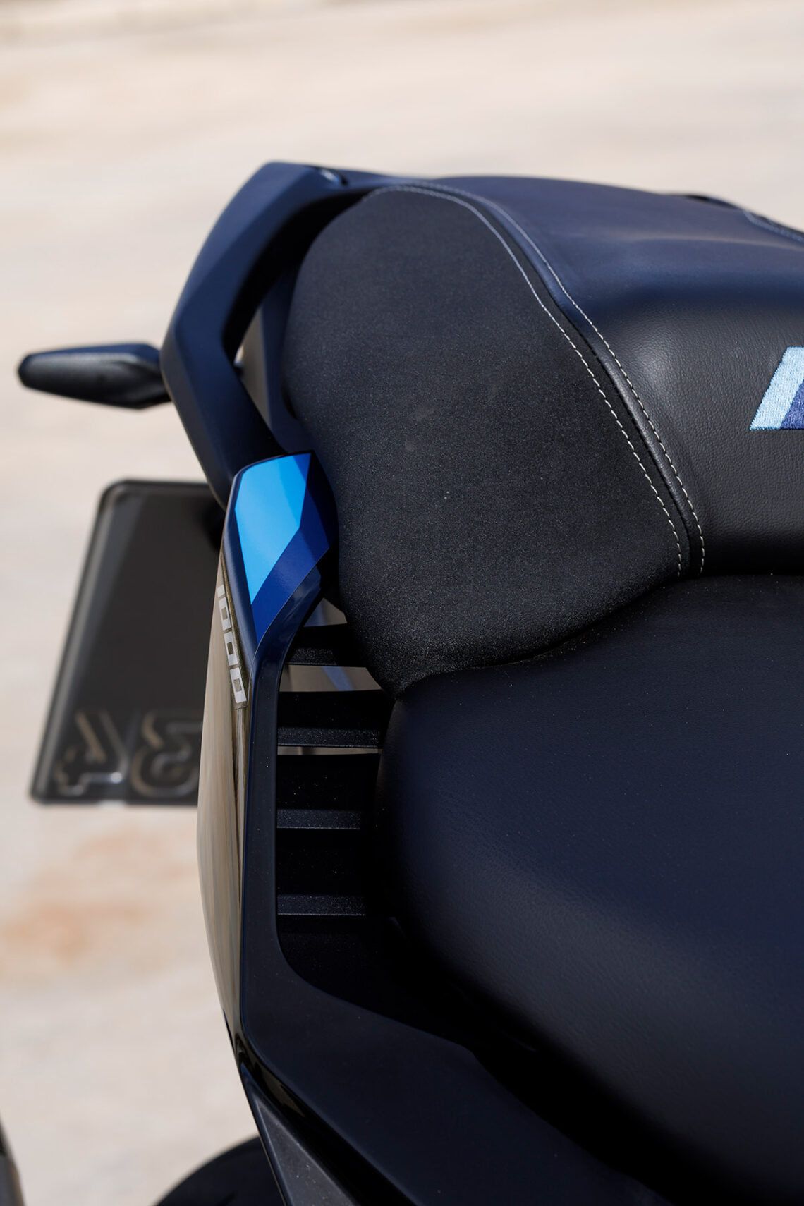 Otros puntos destacables son la instrumentación TFT a color de 6.5" (con conectividad y cuentavueltas rediseñado), las pinzas de freno Nissin M (azul anodizado) con latiguillos metálicos y bomba radial Nissin, iluminación full-LED con luces cuneteras, toma de corriente USB, manetas regulables abatibles fresadas, puños calefactables, llave de proximidad, portamatrícula corto, silenciador de titanio Akrapovic (colector con doble catalizador), guantera smartphone y depósito de gasolina de 20 l. (4 l. de reserva).