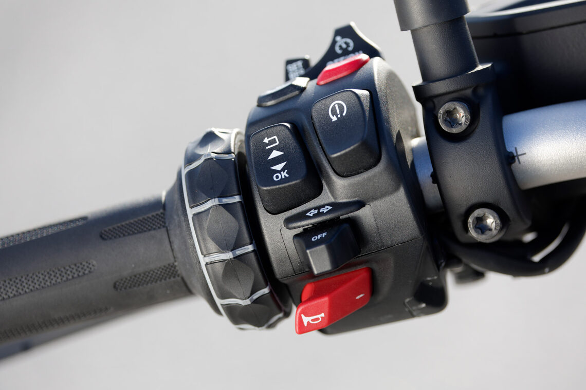 La dotación tecnológica de serie incluye triple modo de conducción (Rain, Road, Dynamic), ABS en curva y frenada semi-integral (al accionar la maneta también frena detrás), control de tracción en curva, control de freno motor electrónico, iluminación full-LED, doble toma de corriente (12V + USB-C) y llave de proximidad.