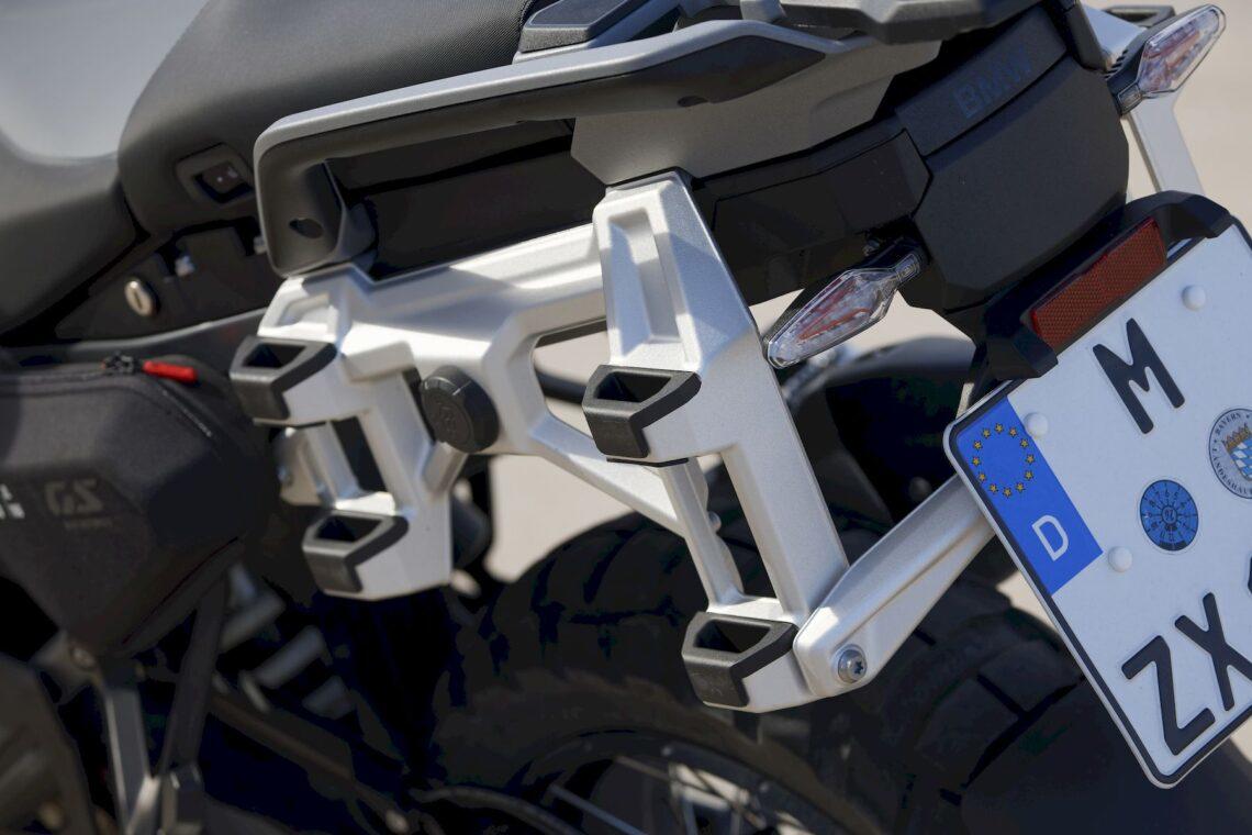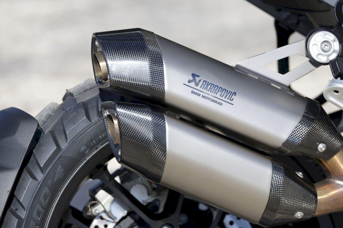Además de los packs Dinámico y Touring, la R 1300 GSA Trophy que también pudimos catar en nuestra prueba sustituía las llantas de radios por otras de aluminio forjado (1.8 kg más ligeras que las de radios, 1.043 €) calzadas con los Karoo 4, añadía silenciador Akrapovic de titanio con doble salida (1.088 €) y una pareja de bolsas laterales de radiador (4 l., 253 €).