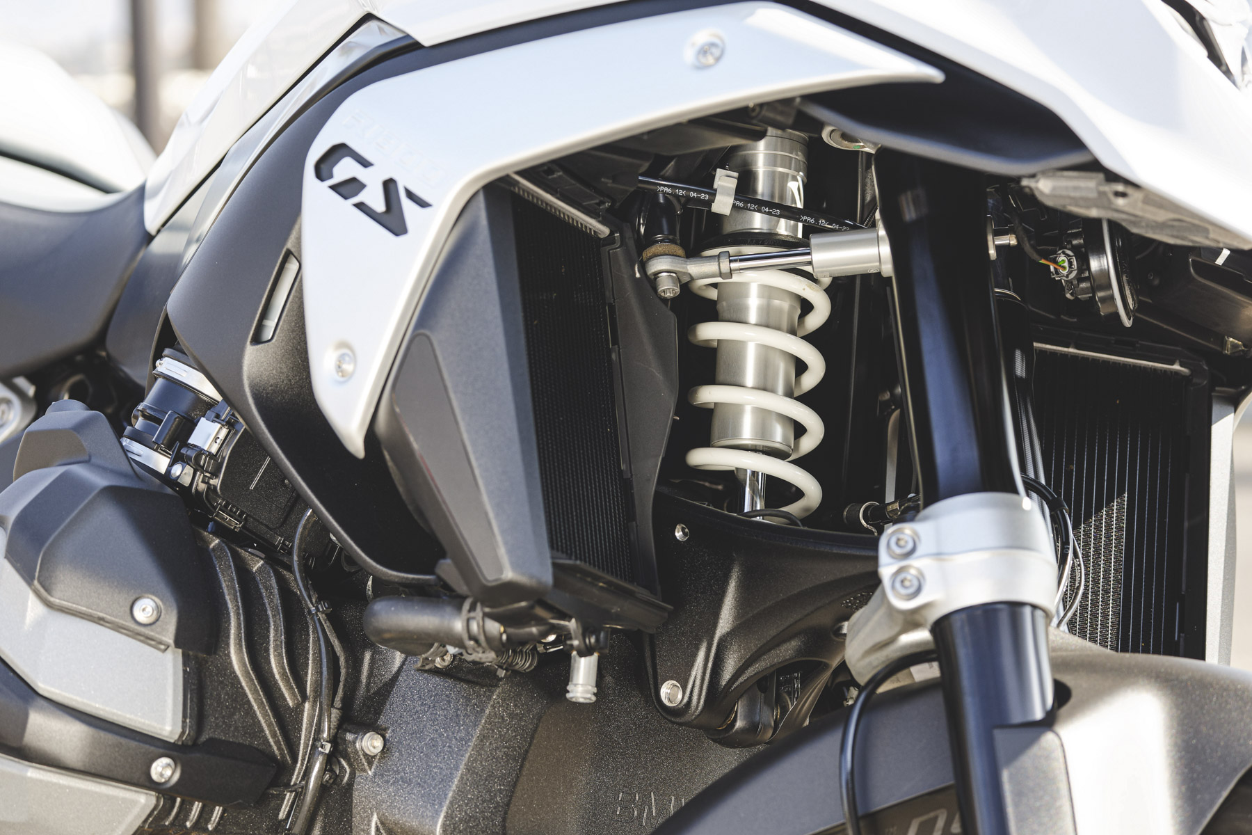 La BMW R 1300 GS Adventure tiene un sistema BMW Telelever EVO delantero con 210 mm de recorrido (190 mm en la estándar) y un sistema BMW Paralever EVO en el trasero con 220 mm de recorrido (200 mm en la estándar).