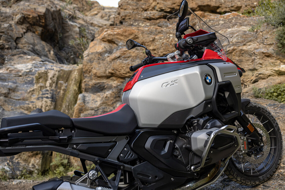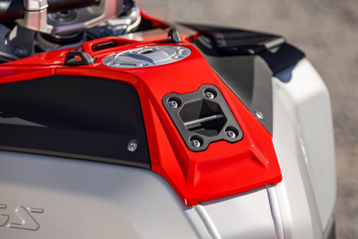 No queremos olvidarnos de ciertos detalles que trae la BMW GS Adventure para ensalzar ese pedigrí de trotamundos, como pueden ser las luces LED auxiliares, protecciones adicionales de motor, paramanos más robustos, parabrisas más grande acompañado de deflectores, soporte para GPS y otros dispositivos, asiento de mayor confort y anclajes en el depósito para fijar piezas de equipaje. Encontramos unas zonas de goma planas sobre el depósito que sirven para dejar algún objeto durante una parada. En esta ocasión, se han diseñado unas nuevas maletas (37 + 36,5 litros) y baúl (37 l) de aluminio con gran capacidad y resistencia con acoplamientos magnéticos que funcionan de conexión eléctrica para tomas de carga USB e iluminación. Puedes tener incluso una ampliación de volumen opcional (10 l por maleta).