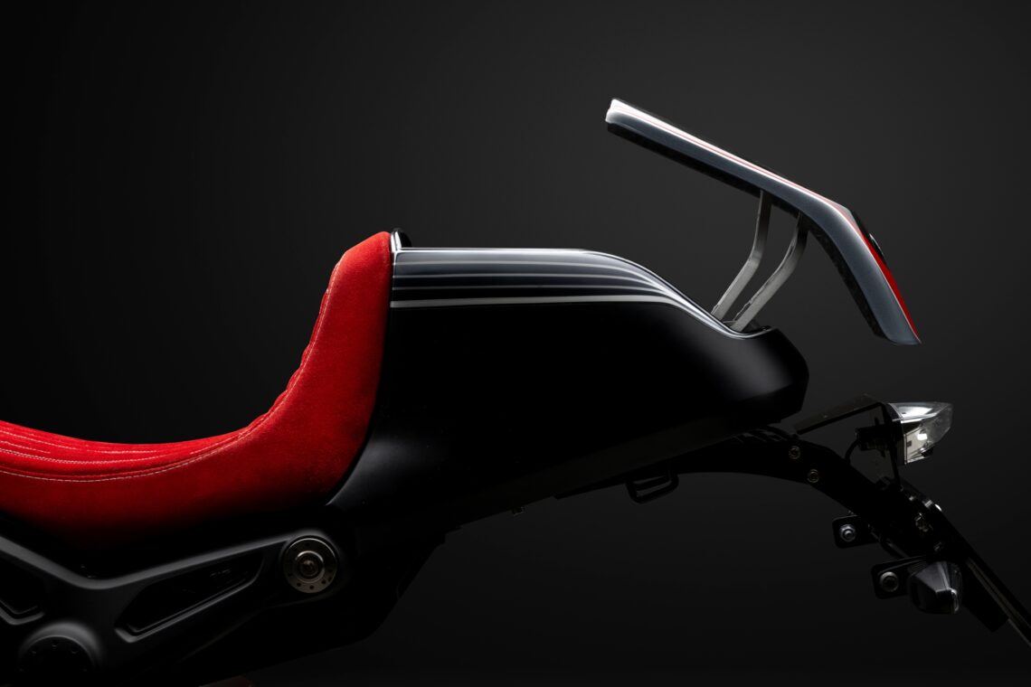 Diseño minimalista del colín para convertirla en monoplaza. Del mismo material (fibra de carbono seca) esconde un compartimento para los guantes que se puede abrir inalámbricamente y compatible con Apple (tarjeta RFID) o Android (tarjeta copiada). Por su parte, el asiento tiene un tapizado disponible en dos colores y patrones personalizables.