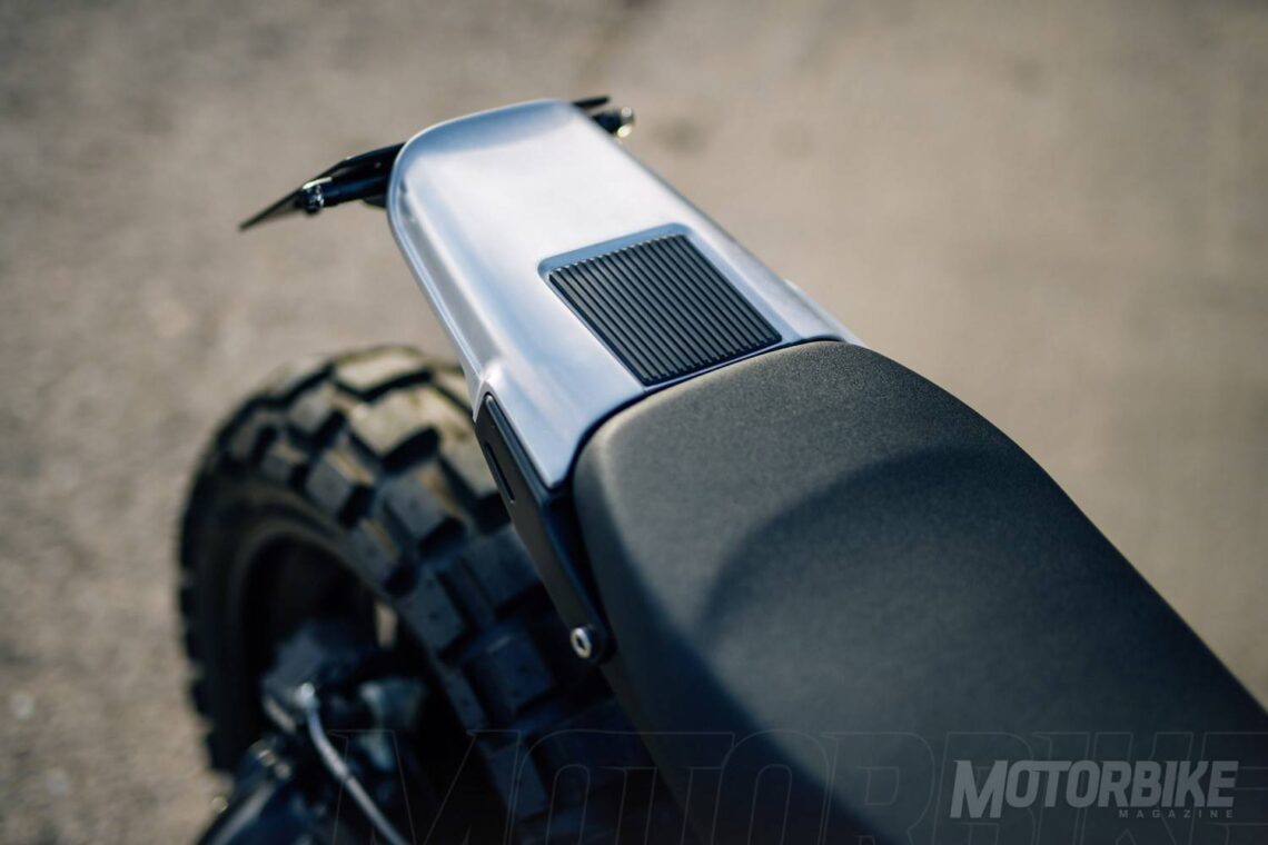 Curiosamente se consigue una estética más moderna que la moto original, ya que no llega a ser una moto retro completamente al mezclar el estilo old-school con otros detalles de diseño más funcionales. Es mucho más estrecha y 6 cm más corta, algo que cambia bastante la sensación de conducción con una posición más adelantada y su maniobrabilidad. El depósito de 10 litros es fabricado en aluminio. También han modificado el air-box, con dos tubos de admisión cubiertos en fibra de carbono. El subchasis también se ha fabricado ex profeso con asiento monoplaza con un colín de aluminio afilado que acaba en un nuevo faro LED. A un lado vemos un escape Arrow con diversas piezas propias.