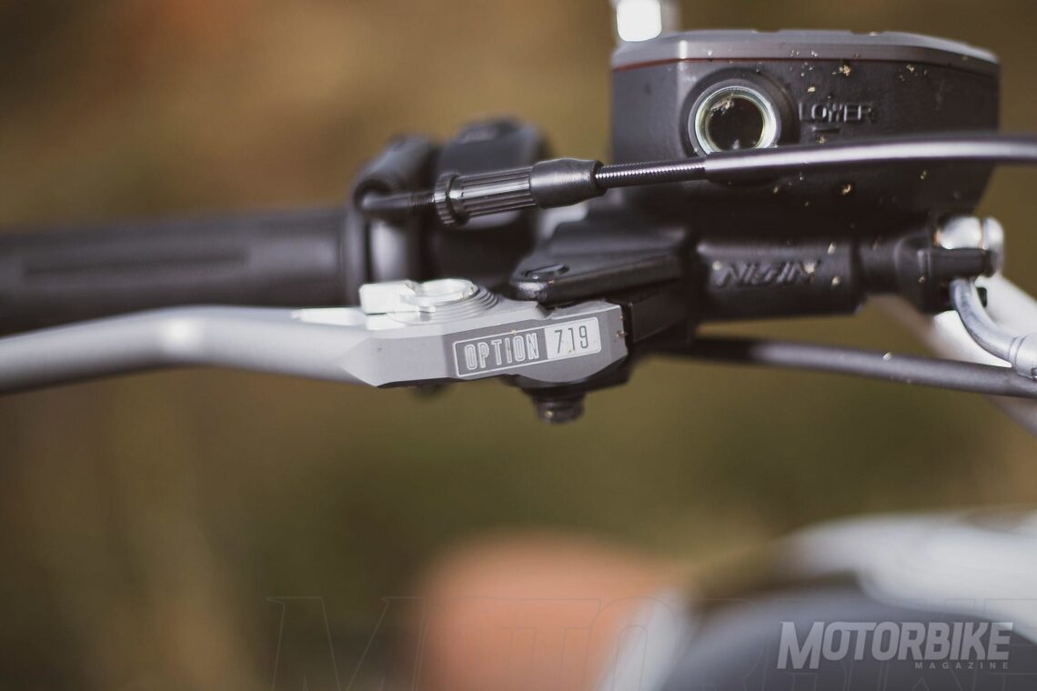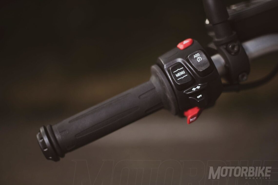 De electrónica solo lleva control de tracción sin niveles de actuación, eso sí, desconectable, también en marcha. Los testigos de ABS y TC están el pequeño display esférico que nos da la información básica para pilotar. Echamos en falta un marcador y un poquito más evolucionado. Si bien es cierto que estéticamente es minimalista, como el resto de la moto, en la práctica nos faltan cosas como un cuenta vueltas y el nivel de gasolina.