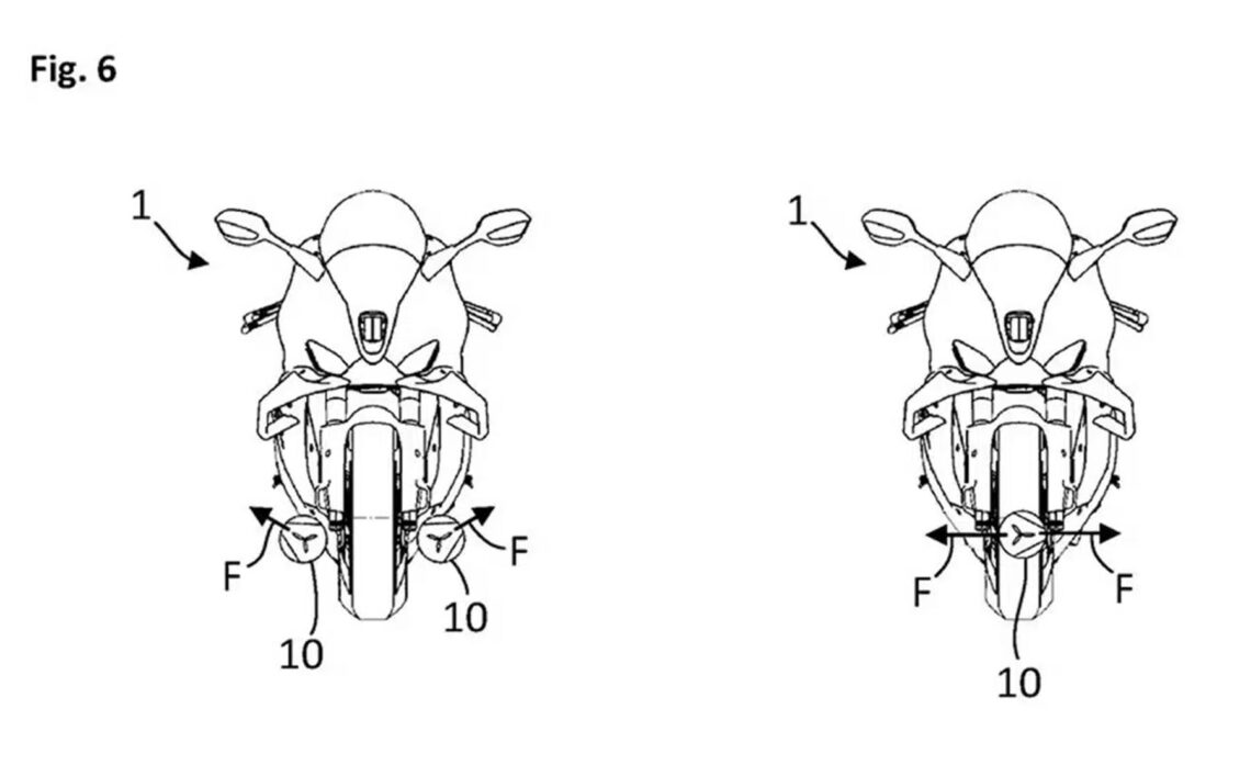 La patente de BMW que se ha filtrado muestra un diseño que "recircula" el aire en la zona delantera de la moto, antes de la toma de mandos, canalizándolo desde la entrada frontal hacia unas ranuras frente a los mandos de la moto. De este modo logra un efecto muy fuerte en la carga aerodinámica de la moto.