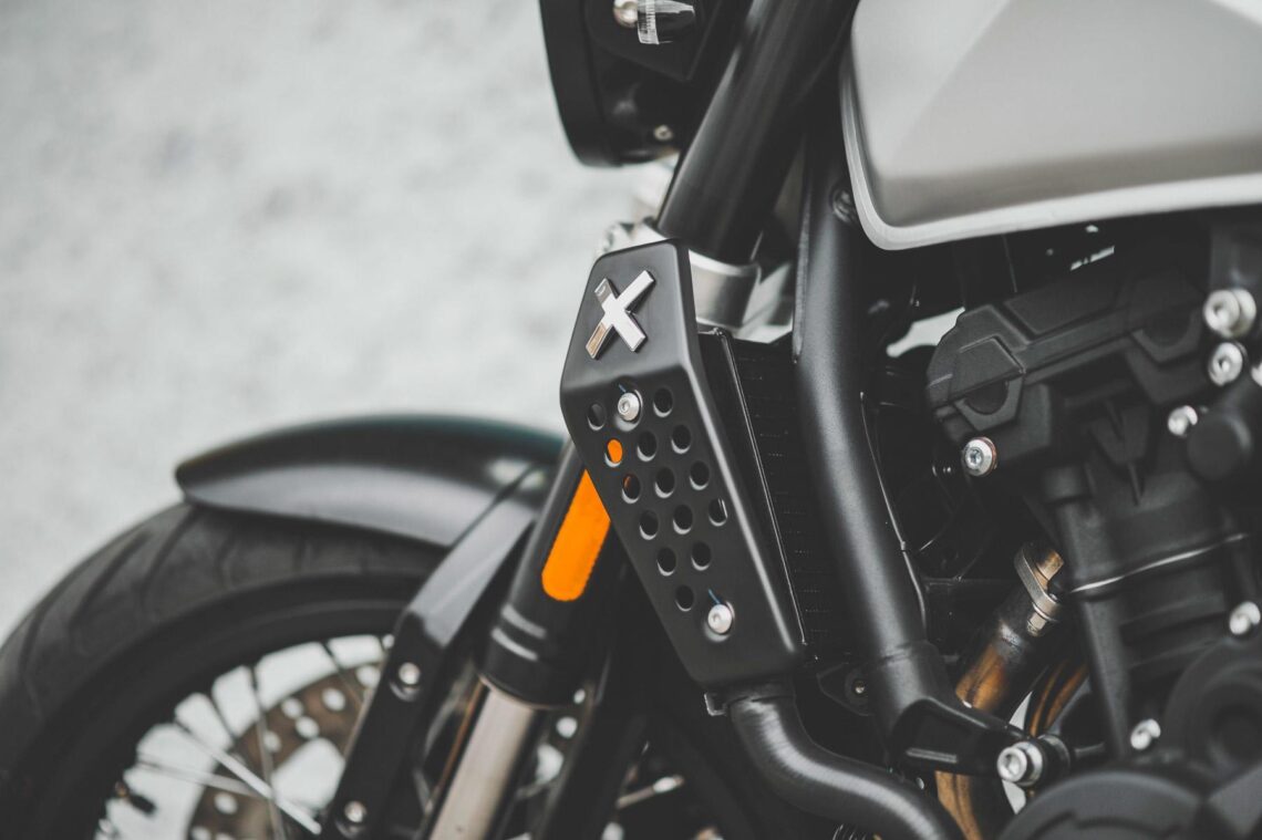 Llama la atención por sus formas. Por ejemplo, el depósito hay que mirarlo de cerca porque merece la pena. Su forma de X, emblema de la marca, es algo totalmente nuevo y que a mí personalmente me ha gustado mucho, por su estética y también por su ergonomía, ya que te recoge las rodillas muy bien. El asiento, la integración los sistemas de alumbrado y freno, los intermitentes, la matrícula baja… todo es armonioso. Chapó para el equipo de diseño.
