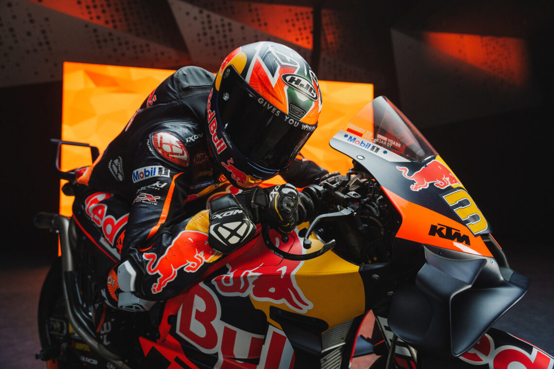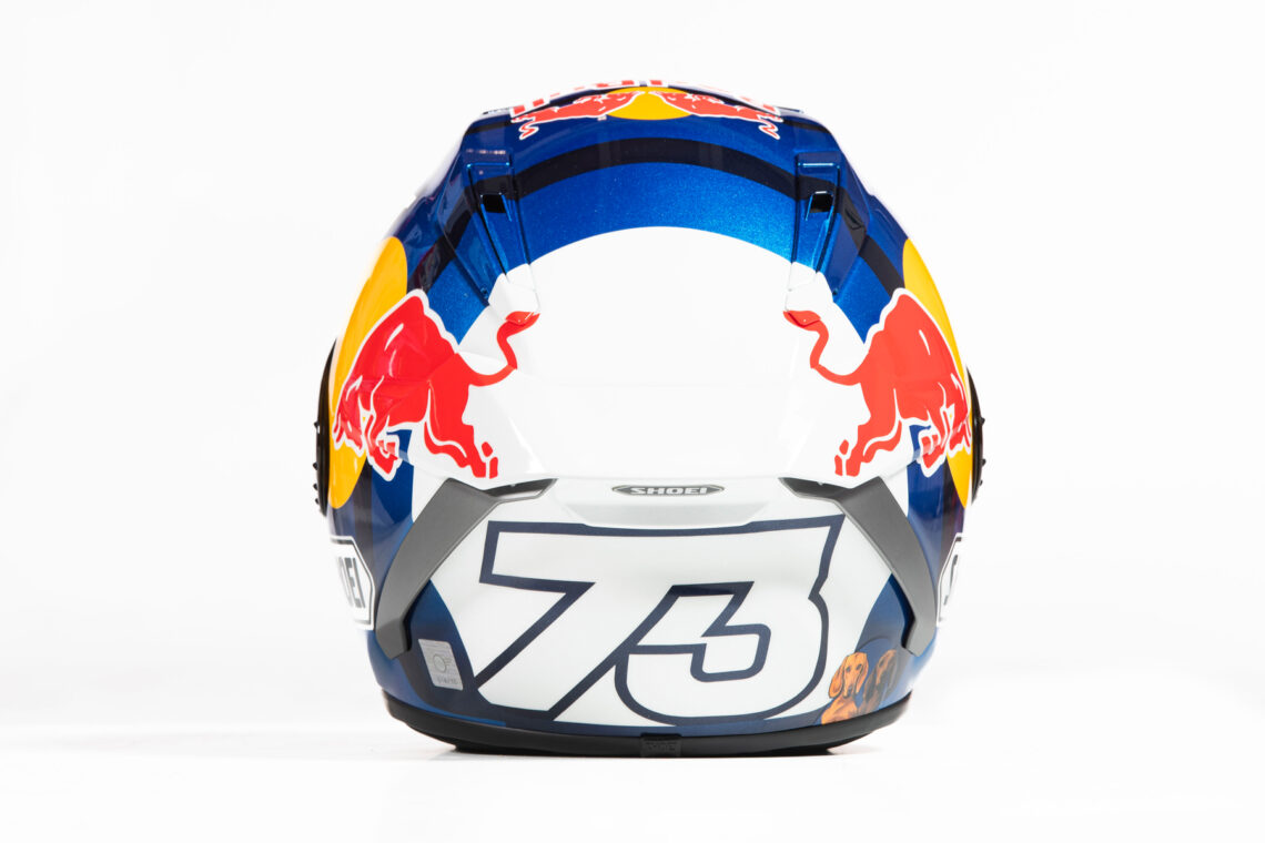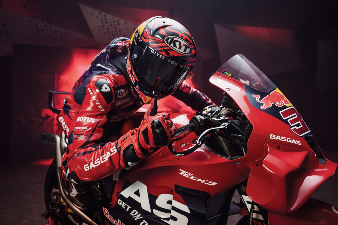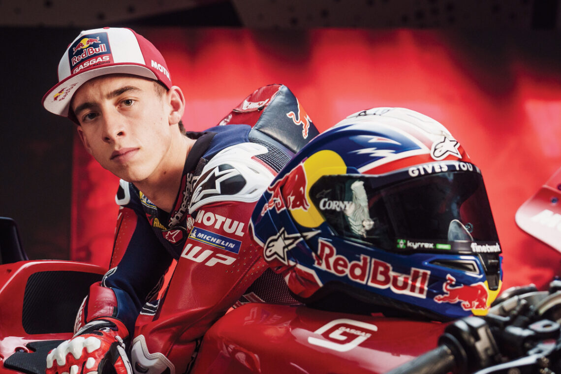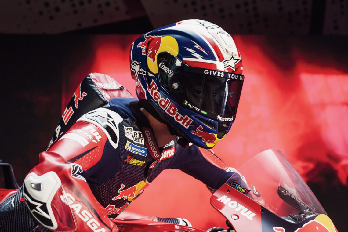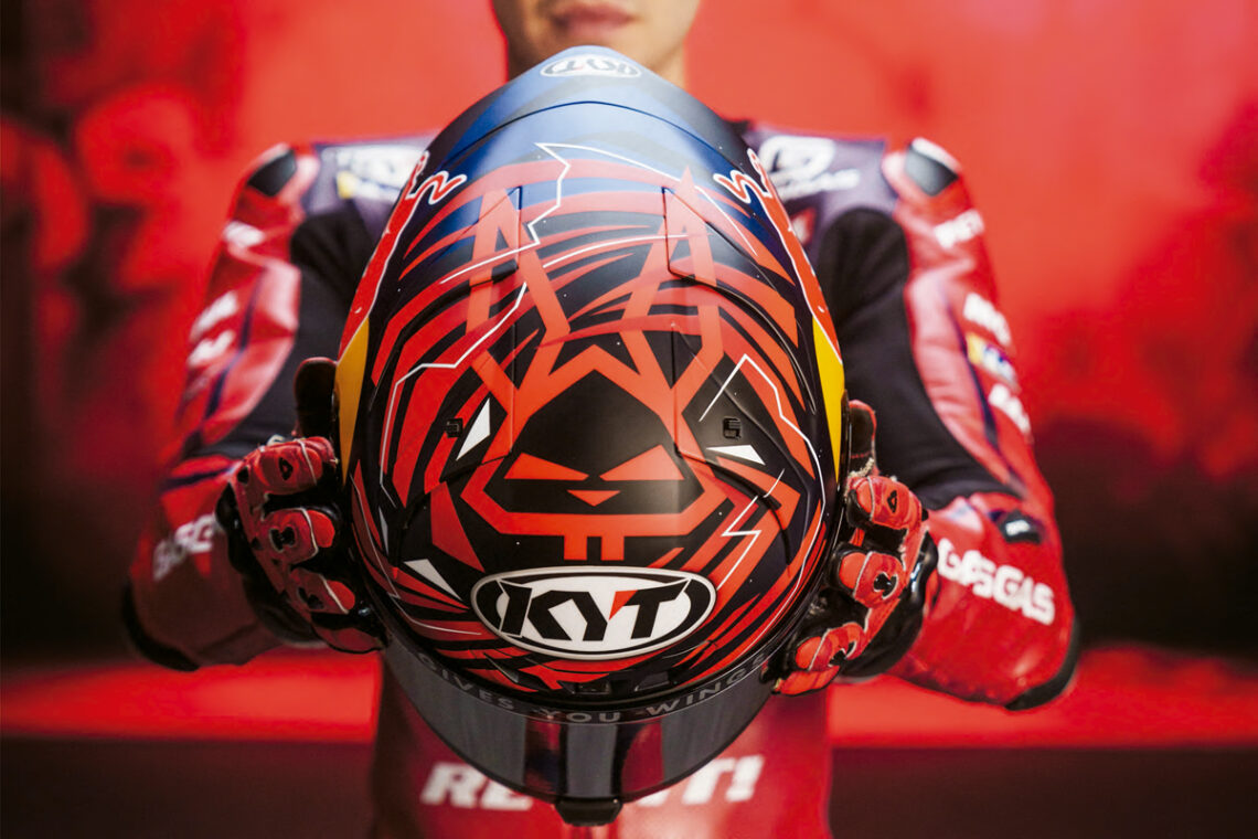 La gran novedad con este casco es Pedro Acosta. El murciano se protegía hasta entonces con MT Helmets, pero en su llegada a la categoría reina ha optado por equiparse con uno de los mejores cascos del mundo. Y lo hace con su inseparable patrocinador Red Bull, que también luce en su nueva GASGAS del equipo Tech3.