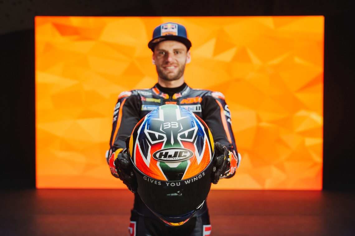 En el caso de Brad Binder, desde que llegó a la categoría reina en 2020 siempre se ha protegido con HJC. Y también comparte con Quartararo una mirada en su parte superior, aunque en el caso del sudafricano son colores naranjas y azules para combinar mejor con su KTM RC16.