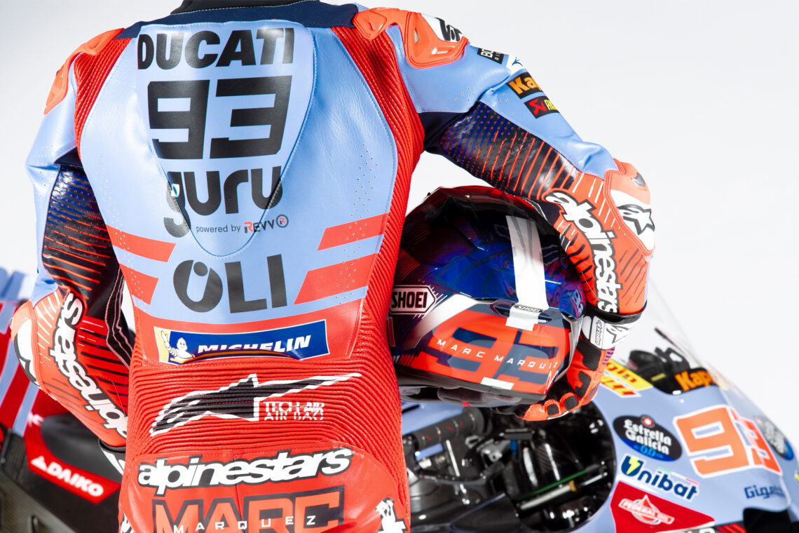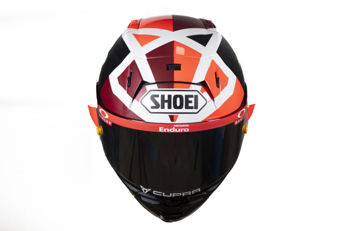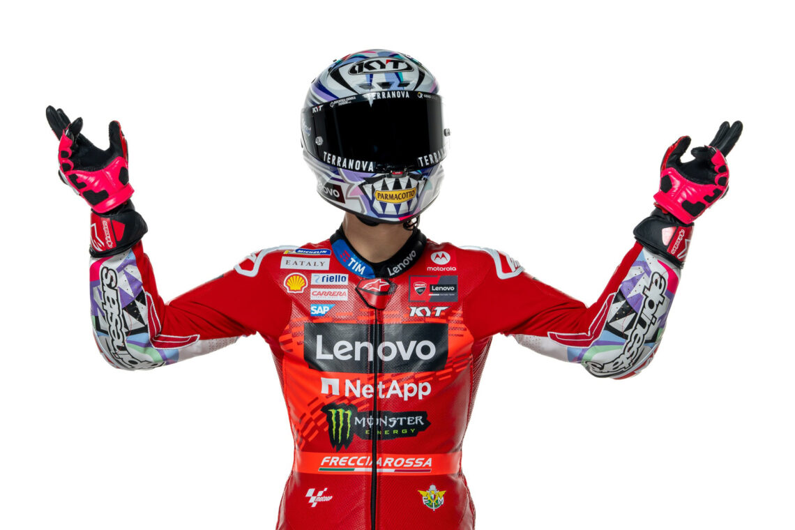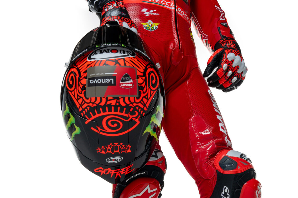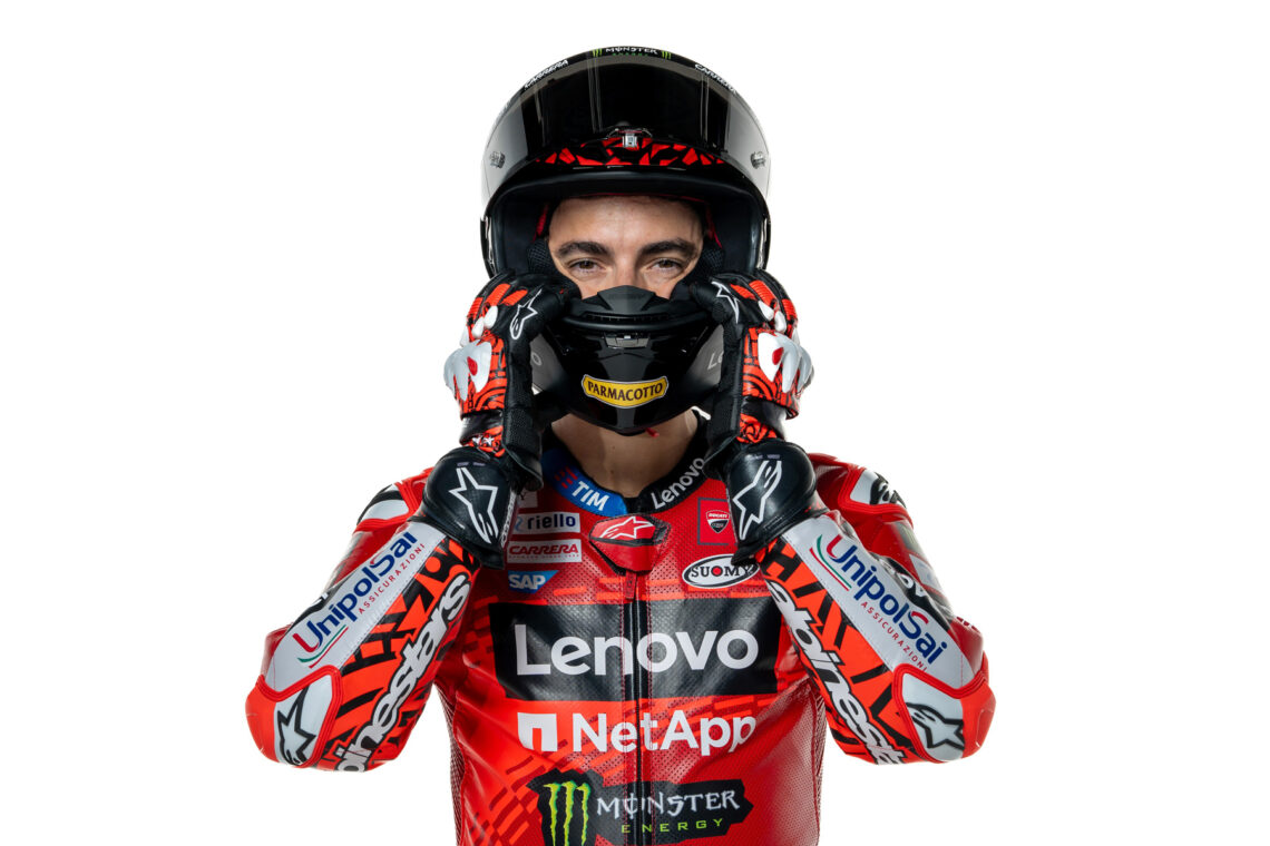 También se equipa con el SHOEI X-SPR Pro su hermano Álex Márquez, que a diferencia del #93 opta por colores azules que son muy similares a los de 2023. Por último, el italiano Fabio Di Giannantonio cambia de equipo y también de diseño, escogiendo para 2024 colores rojos y blancos para su Desmosedici GP 23.