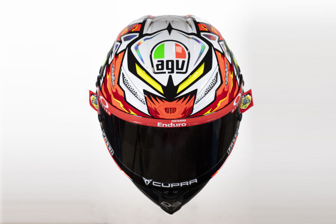 Partiendo desde su hermanastro, Luca Marini, quien lleva junto a AGV desde sus inicios. Su reconocible casco naranja combina con el equipo japonés, a pesar de que en este ya no predomina la petrolera española. También ha fichado por un nuevo equipo de cara a este año Franco Morbidelli, aunque su inconfundible color verde sigue presente junto a su nuevo box del Prima Pramac Racing. También fiel a AGV desde campeonatos inferiores, el italiano lucirá un Pista GP RR que combina la bandera italiana con la brasileña. El tercer clasificado en 2023, Marco Bezzecchi, sigue en Ducati, pero sus colores cambian por completo. Nuevo look para el #72, pero no puede faltar su reconocible escorpión en su casco.