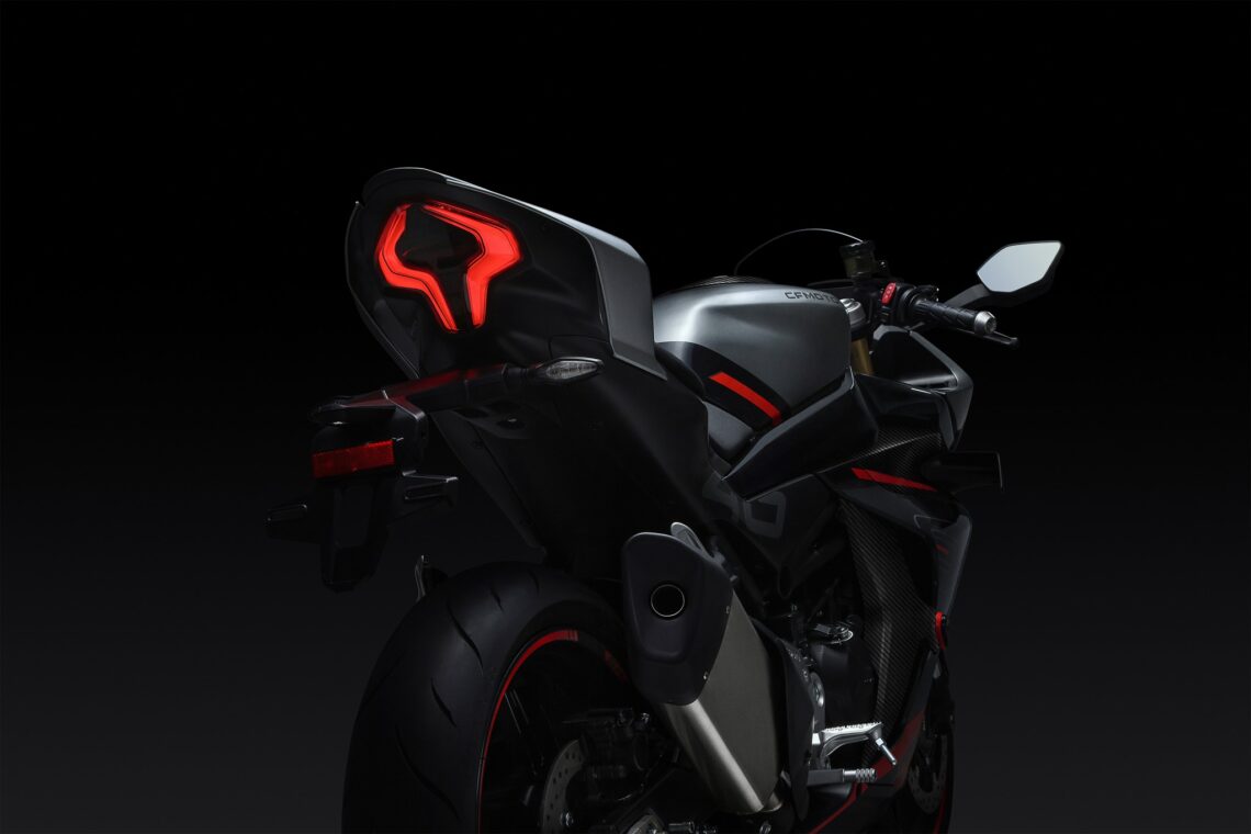 La estética de la CFMoto 450SR sigue siendo verdaderamente espectacular y parece tener pocos cambios respecto al concept más allá de los retrovisores, mullido de asiento más cómodo, luces más grandes, escape homologado bajo y el porta-matrícula. También se ha optado finalmente por un basculante convencional de doble brazo en vez de el monobrazo. Por su parte, los componentes delicatessen que vimos hace meses se han sustituido por elementos más lógicos y baratos. Por ejemplo, en vez de la doble dotación delantera con Brembo, llega a la calle con un solo disco delantero de 320 mm, aunque sí que sigue confiando en una pinza Brembo de anclaje radial. Detrás el disco es de 220 mm. En cuanto a las suspensiones, no hay mucha información, pero seguro que de serie no traerá las Öhlins de alto rendimiento vistas en el prototipo. Las líneas de esta moto están firmadas por el estudio Modena 40 localizado en la zona de Rimini (Italia), un diseño que ha pasado por más de 200 simulaciones de cálculos aerodinámicos, más de 30 horas de experimentos en el túnel de viento y más de 20 evoluciones de optimizaciones de diseño y que le han dotado de este aspecto tan deportivo, incluyendo las aletas laterales, que, según la marca, aportan 2 kg adicionales de efecto suelo a 120 km/h. Otra curiosidad es que se ofrecerá en tres alturas de asiento: 785 mm, 795 mm y 815 mm.