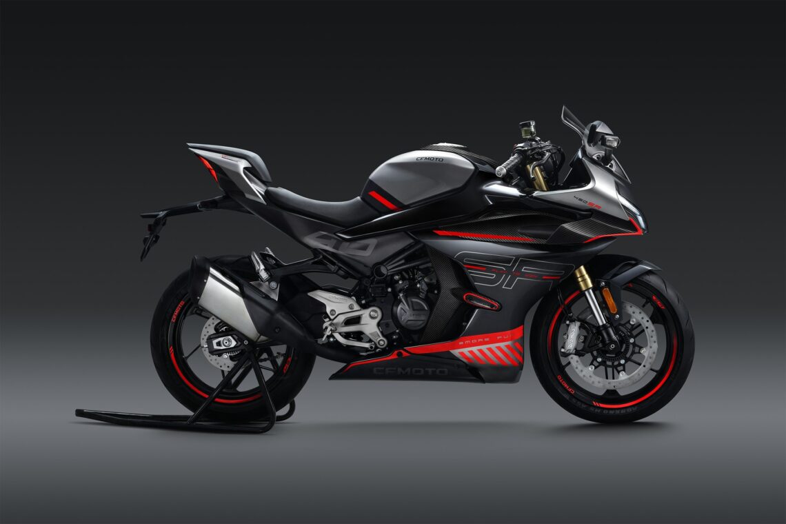 Para empezar, tenemos que recordar que se trata de una moto deportiva con motor bicilíndrico en paralelo de 450 cc, por lo que no podemos esperar el rendimiento de una superbike, pero sí que los números que nos confirman en sus materiales de promoción son bastante relevantes teniendo en cuenta su cilindrada: 50 cv de potencia, 168 kg de peso y par motor de 39 Nm. El motor parece un desarrollo completamente nuevo y que no tiene mucho que ver con el actual '400' bicilíndrico de la CFMoto 400NK, pudiendo ofrecer también un bloque más compacto y ligero. De hecho, es una adaptación del ya conocido dos cilindros de 'seis y medio' que utiliza la marca en otros modelos. Llama la atención que, a diferencia de la tónica habitual en la marca, este motor está configurado con un calado del cigüeñal a 270º (el resto a 180º) que intenta imitar el pulso de un motor en V a 90º.