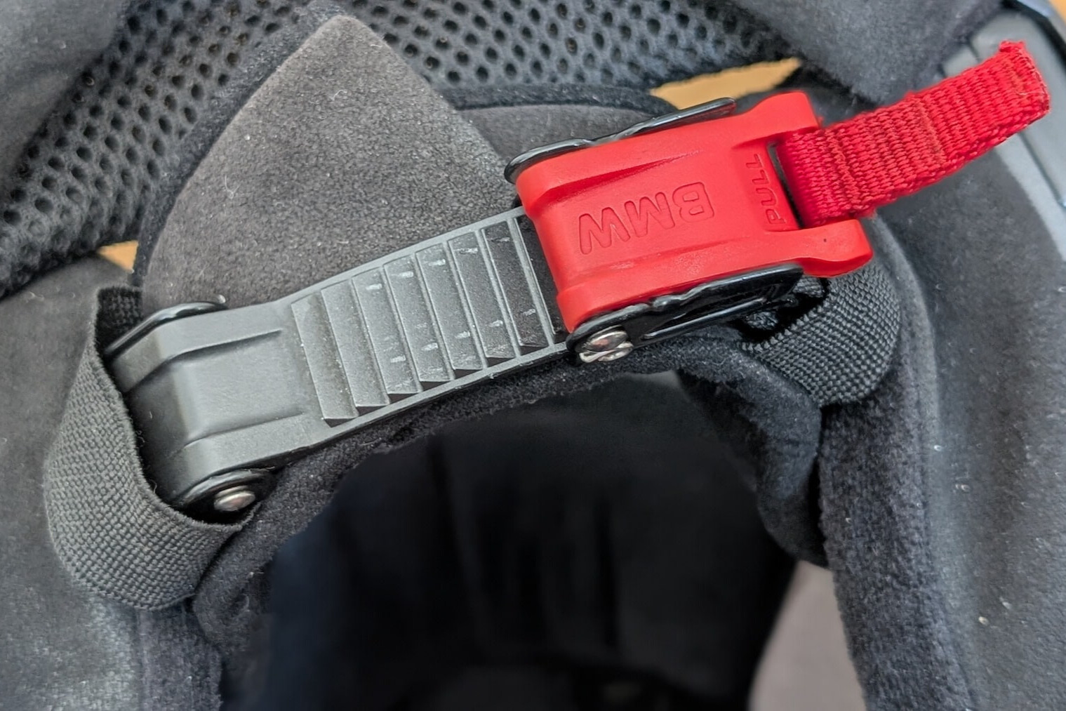 Es el típico cierre que vemos en la mayoría de cascos modulares, jet o touring, donde la practicidad manda. Para liberarlo, basta con tirar de la cinta del cierre, liberando así el enganche dentado, y la corre se abre fácil y rápidamente.