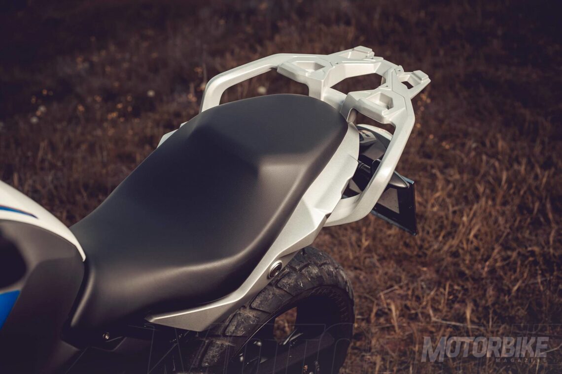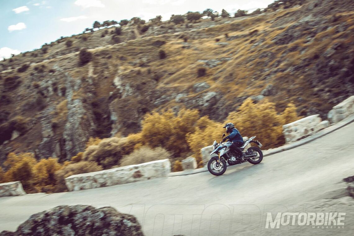 Por contra, lo que se consigue con esta configuración de suspensiones, los neumáticos Metzeler Tourance y la elección de neumático delantero de 19 pulgadas (en vez de 17) es mayor versatilidad para poder afrontar viajes con mayor comodidad y, sobre todo, cierta libertad para afrontar pistas de tierra de contenida dificultad. Que la BMW G 310 GS ha pensado en su vertiente off-road se demuestra también con que, a diferencia de su hermana, cuenta con ABS desconectable de la rueda trasera. Se desactiva manteniendo pulsado un botón en la piña izquierda, algo que agradecerán todos los amantes de la conducción más campera y de puro trail. La parrilla portabultos con asideros más grandes para el pasajero la hacen también muy propicia para viajes, aunque un aumento de la capacidad del depósito (11 l, igual que la R) le habría dado un toque aún más viajero que su hermana.
