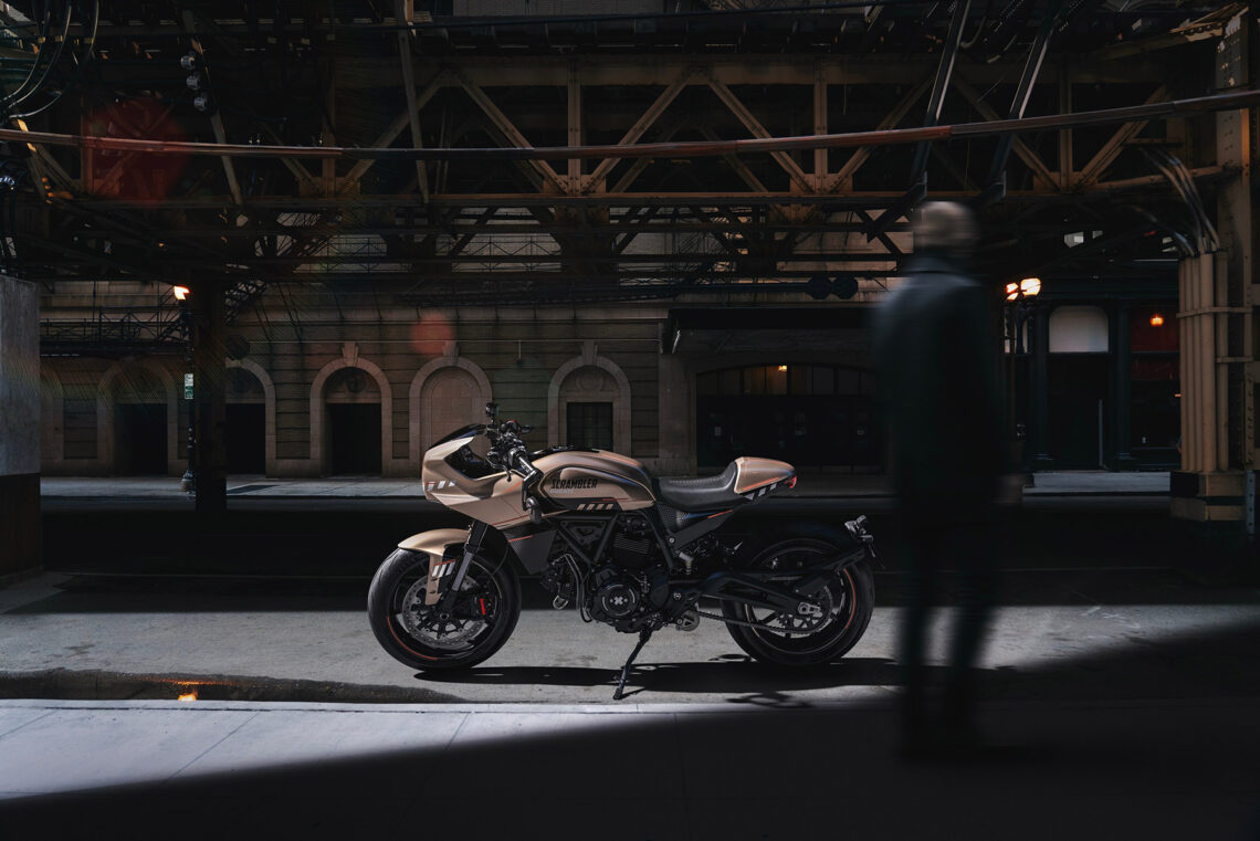 El modelo CR24I se inspira en la historia de los motoristas británicos de los años 60, quienes se desafiaban a completar una vuelta por sus carreteras antes de que un disco terminara de sonar en un tocadiscos. Diseñado íntegramente en el Centro Stile Ducati, este concept destaca por su llanta delantera de 17" con neumáticos de carretera y un manillar deportivo con los retrovisores integrados en los extremos. El carenado montado en el depósito, estrecho y envolvente, evoca a modelos tan icónicos como la Pantah y la 750 SS, pero con un toque contemporáneo que refleja el espíritu Scrambler.
