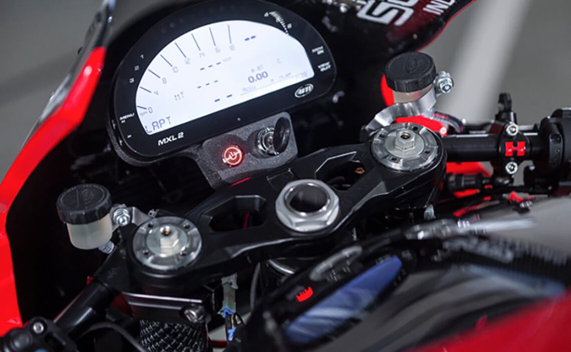 En cuanto a las especificaciones de parte ciclo y peso, estamos ante una moto de 220 kg (de los cuales 80 kg son las baterías). El chasis es un diseño de acero en cromo molibdeno de Bakker, ataviado a un basculante de aluminio de Bakker también. El tren delantero cuenta con una suspensión Öhlins USD con barras de carbono y tratamiento cerámico. Los frenos viene de la mano de HEL, con unas pinzas específicas HEL Performance. También encontramos unas llantas Marchesini de aluminio en 17 pulgadas.
