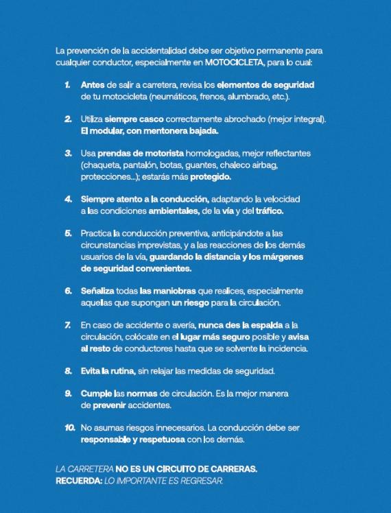 La DGT, por si sirve de ayuda, ha publicado este 'Decálogo de prevención de siniestralidad vial en la conducción de motocicleta':