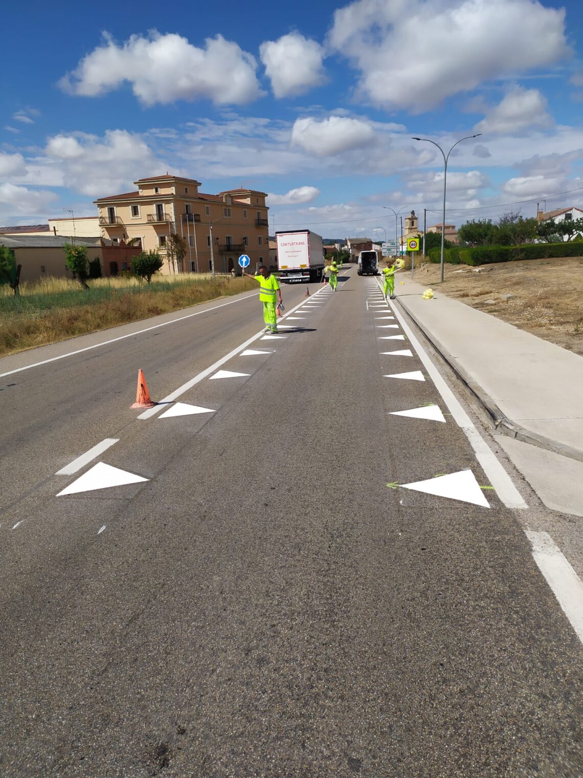 Mitma ha dispuesto un tramo experimental en la travesía de la N-122 Nava de Roa (#Burgos) con nuevas marcas viales: 'dientes de dragón' y 'líneas de borde quebradas' antes de un nuevo paso de cebra.#DGCarreteras pic.twitter.com/74KPUnxWub
