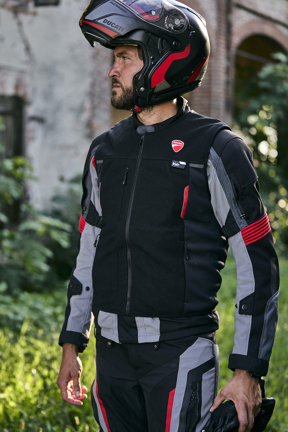 Tras aplicar la investigación y tecnología utilizada en los monos de cuero que visten sus pilotos en MotoGP, Ducati crea esta prenda sin margas, versátil y apta para todo tipo de usuarios, ya que no requiere conexión con la moto y se puede vestir bajo o sobre cualquier tipo de chaqueta, ya sea de hombre o de mujer.