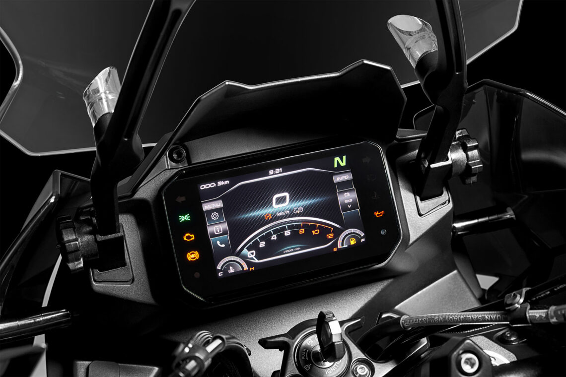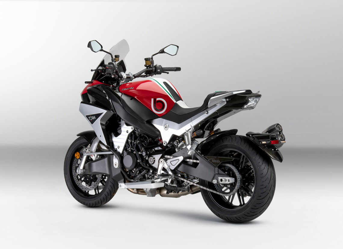 La exclusiva firma italiana se adentra en el segmento maxitrail con la Tera, una moto que combina su peculiar sistema de suspensión delantera alternativa Tesi con la mecánica tetracilíndrica en línea sobrealimentada de la Kawasaki H2. Sus cifras asustan: 998 cc, 200 CV a 11.000 rpm, 137 Nm a 8.500 rpm y 0-100 km/h en 3.5 segundos (hasta 200 km/h en 8.2 seg). Suspensión electrónica semi-activa Marzocchi opcional (equipo Öhlins TTX36 de serie), pinzas de freno Brembo Stylema, piezas de aluminio/fibra de carbono y escape de titanio Akrapovič aderezan el conjunto.